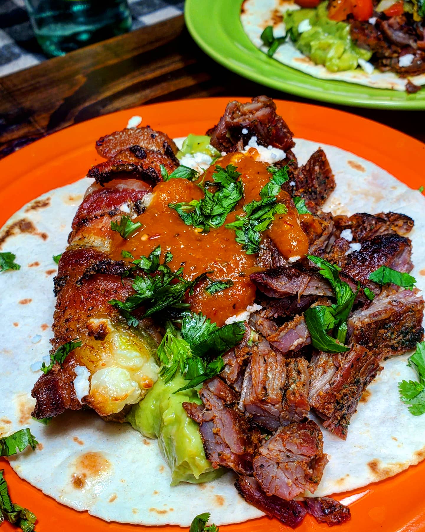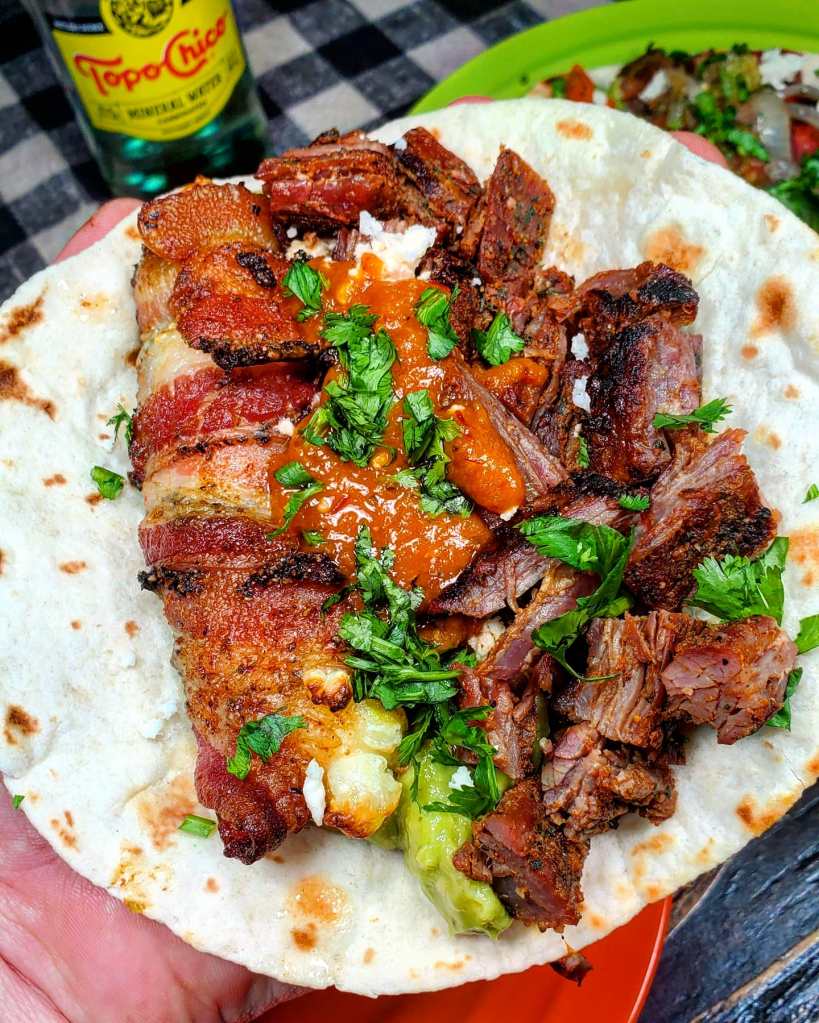 The first taco was carne asada, guacamole, and a bacon wrapped queso stuffed jalapeno with little cilantro and a spoonful of slayermade salsa roja. The second was a carne asada and smoked sausage taco filled with guacamole, red and green bell peppers, grilled onions, and topped with a slayermade salsa verde. AND of course washed down with a cold @topochicousa