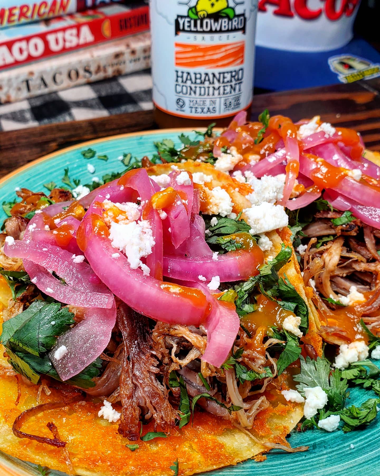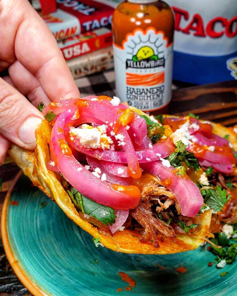 Busted out some classic carnitas tacos last night. Slow cooked pulled pork topped with pickled maple syrup red onions, cilantro, queso and some major droppings of @yellowbirdsauce Habanero Condiment.. this was my first time trying Yellowbird and I’ve got to admit the flavor is original, tasty, and had a solid heat level. Looking forward to trying more of the brands flavors.