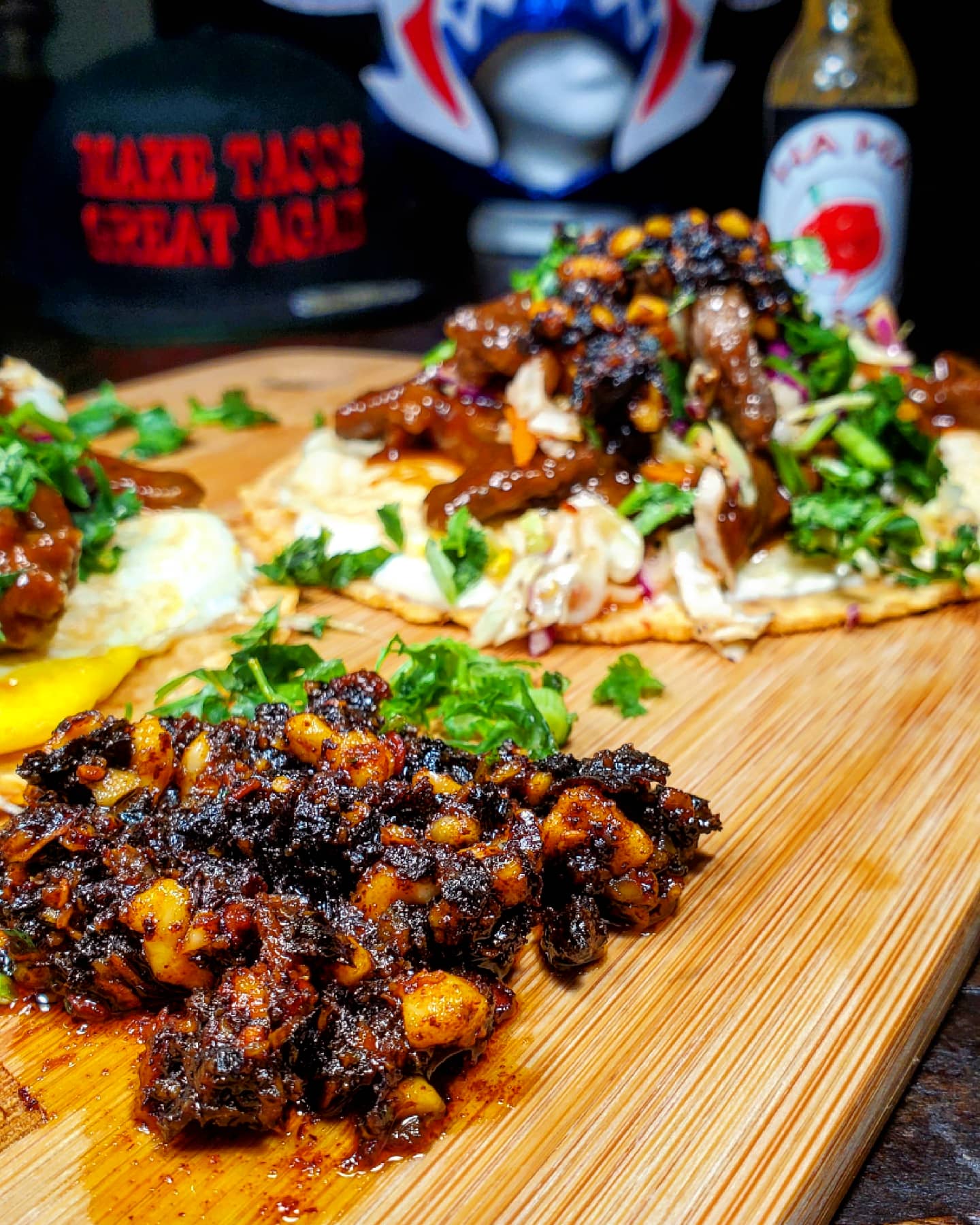 The evilest thing on this taco would be the wild reaper infused salsa macha. With dried passillas , chile arbol, carolina reapers, garlic, nuts, and oil we mixed up a pretty awesome looking and great tasting concoction.