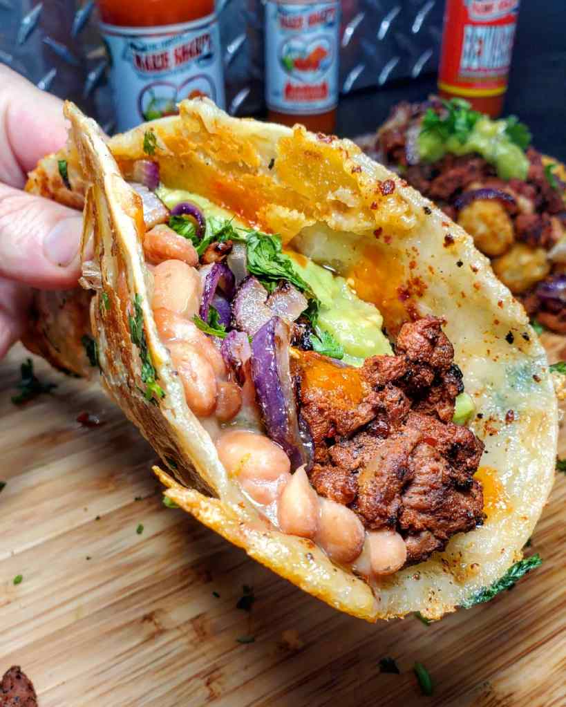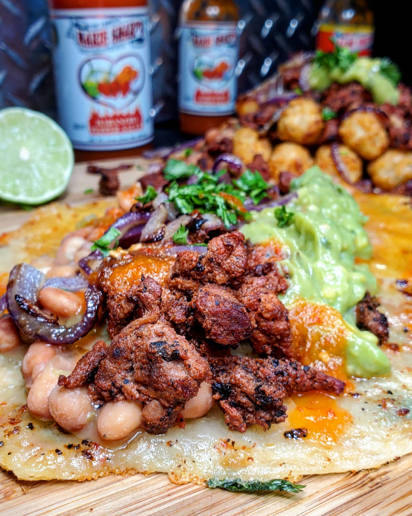 Made dinner solo last night and it got a little gnarly. It started off with some KILLER flour tortillas and melted habanero cheese to one side before dropping in some pinto beans. I picked up some pre seasoned carne adobada and grilled that up in the cast iron before laying it in there next to the pintos. Next to the carne sat a generious helping of @yucatanguac and above this epic trio I dropped in some grilled red onions and cilantro. I finished this taco off with @mariesharpsusa Habanero Pepper Sauce and repeated the whole process on the tots. Sooooo fraking tasty.