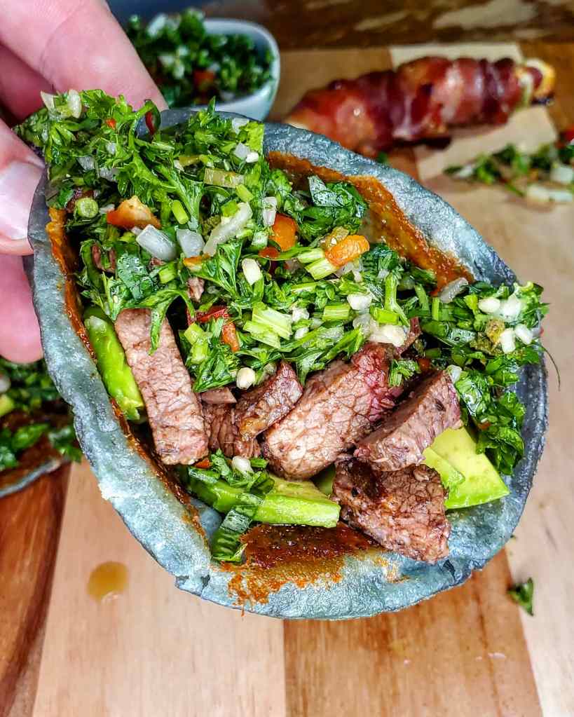 The tortilla was of the blue corn variety and while I knew it was going to be tasty I still had my doubts on if it could support the massive amount of meat and chimichurri I planned to place inside. I solved this by melting some Oaxaca queso to one side giving it the stability needed and adding another excellent ingredient to this taco.