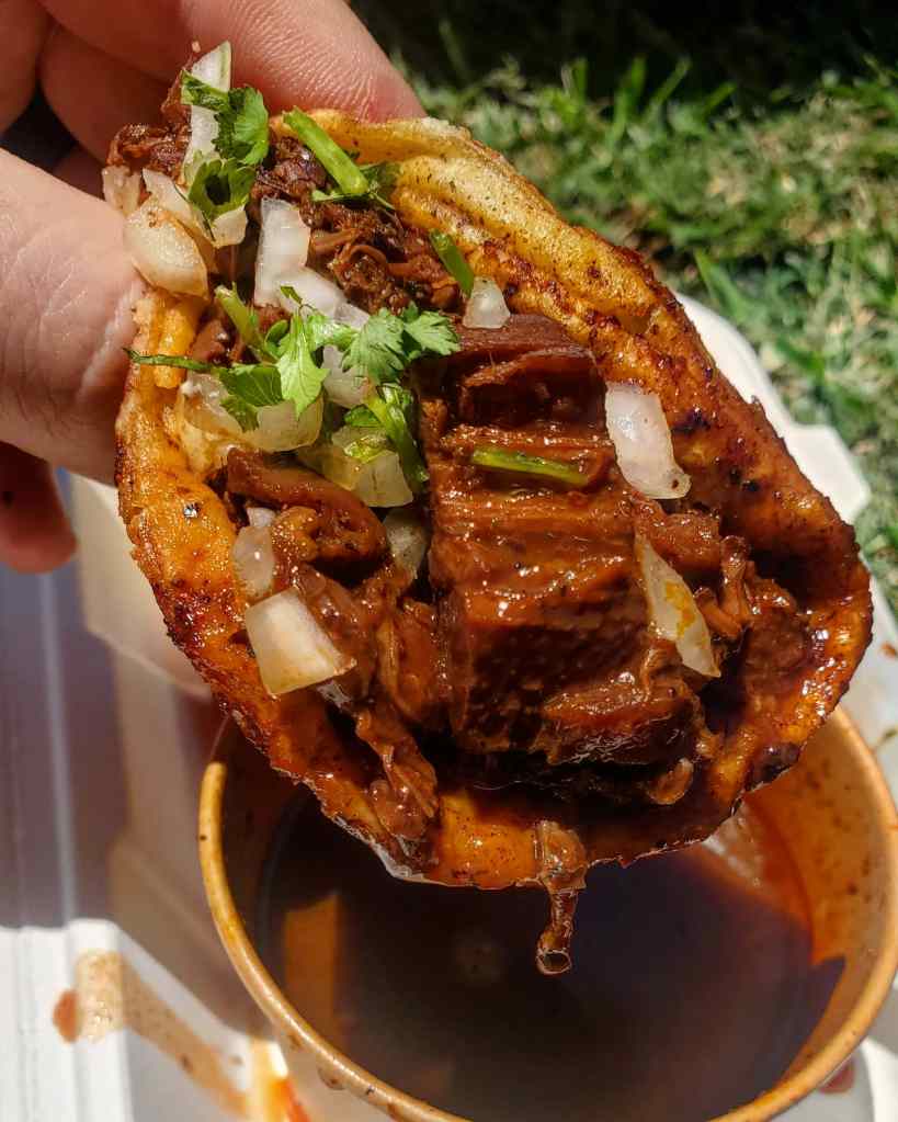 I ordered up a couple jackfruit birria tacos with a side of consume and a single potato/walnut chorizo taco.