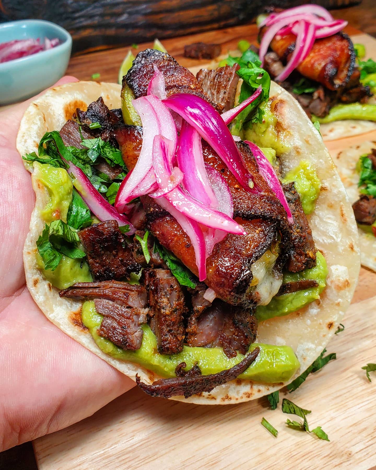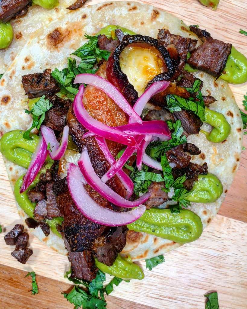 These tacos start with a small flour tortilla, from @elcomalproducts , toasted and covered in guacamole, from @yucatanguac . Next I place hefty layer of carne asada meat before slapping in some cilantro. Mounting this taco is the bacon wrapped jalapenos and some tasty vinegar soaked red onions.