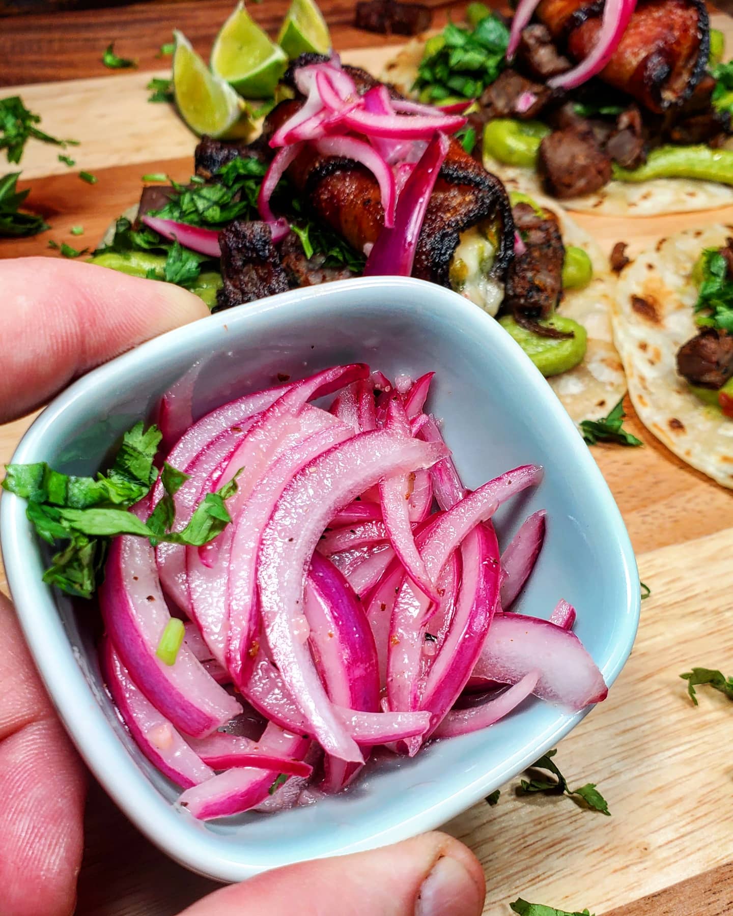 The bacon wrapped and queso stuffed jalapenos are definitely the highlight of this taco. The bacon we used was a THICK peppered cut and the cheese stuffing was a spicy jalapeno jack. The Rollies or Poppers take about 20 min to cook which gave me ample time to prep and cook the meat and red onions.