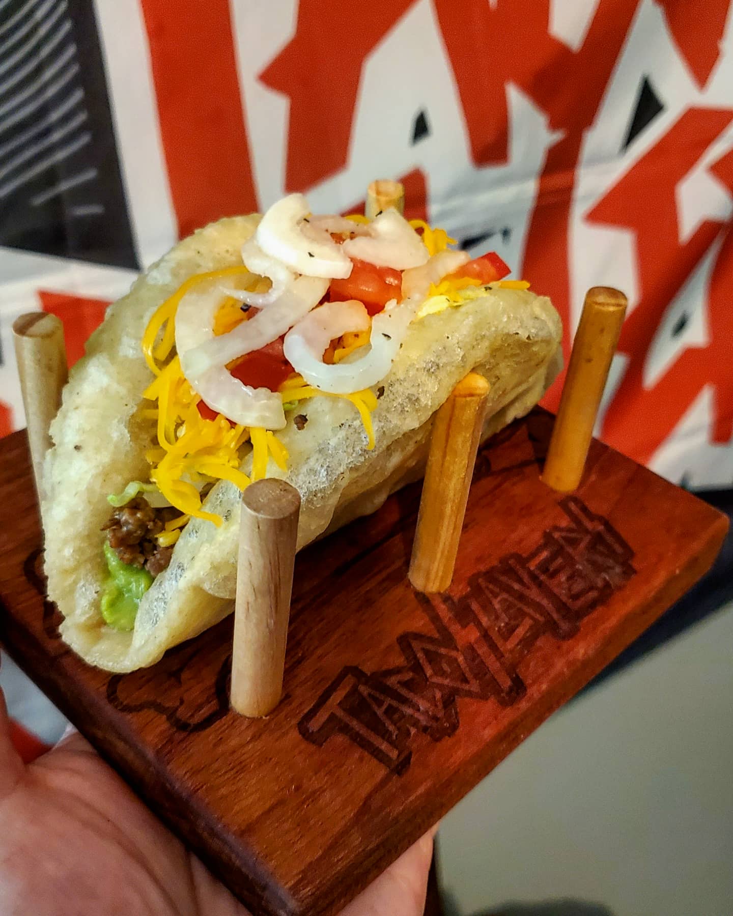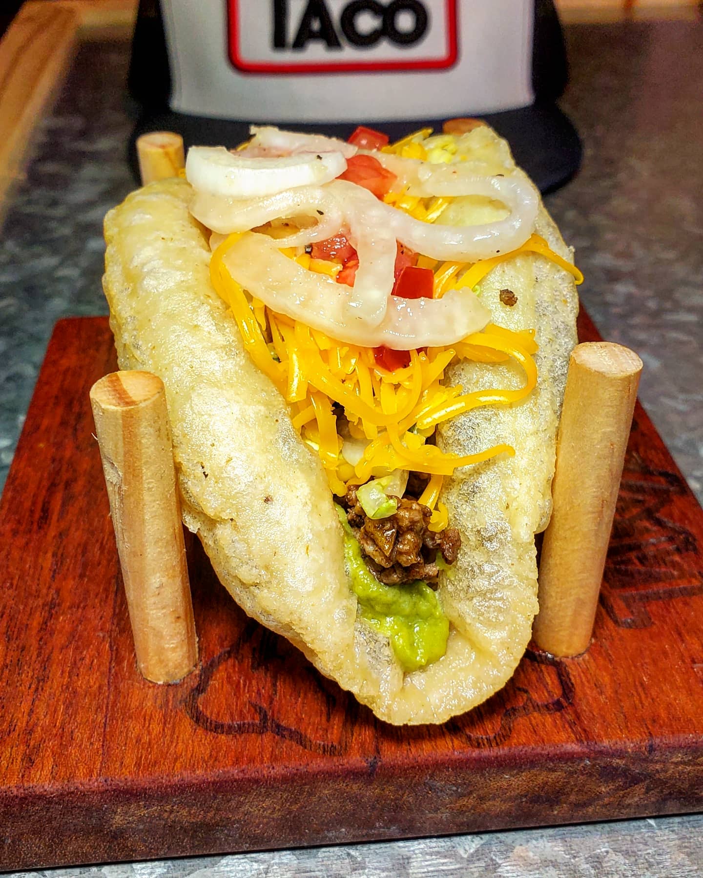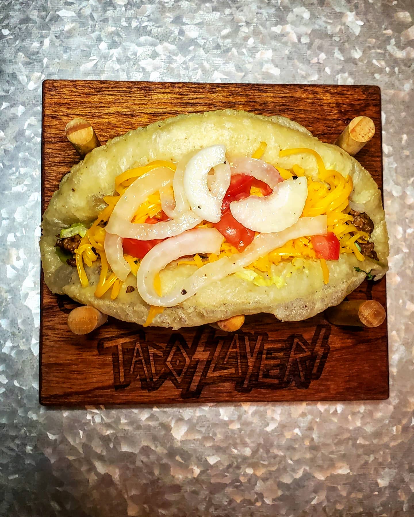Each Puffy has to be worked in the fryer by hand into shape. Some look crazy but they all taste the same. Pictured is the most perfect tortilla I’ve ever made 😍. These tacos a stuffed full with ground beef with bacon fried papas mixed in, a layer of guac, shredded cheddar, deli style shredded lettuce , chopped tomato, cilantro and finally some vinegar and lime juice soaked onions.