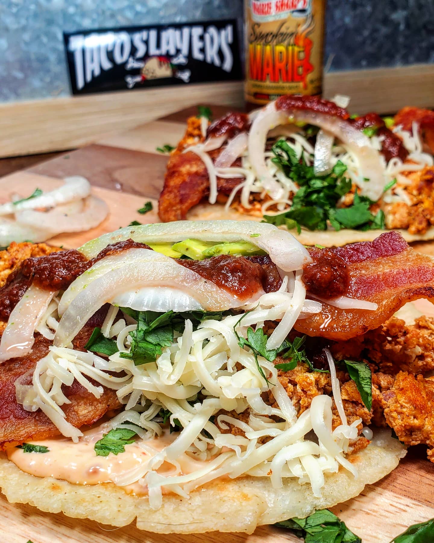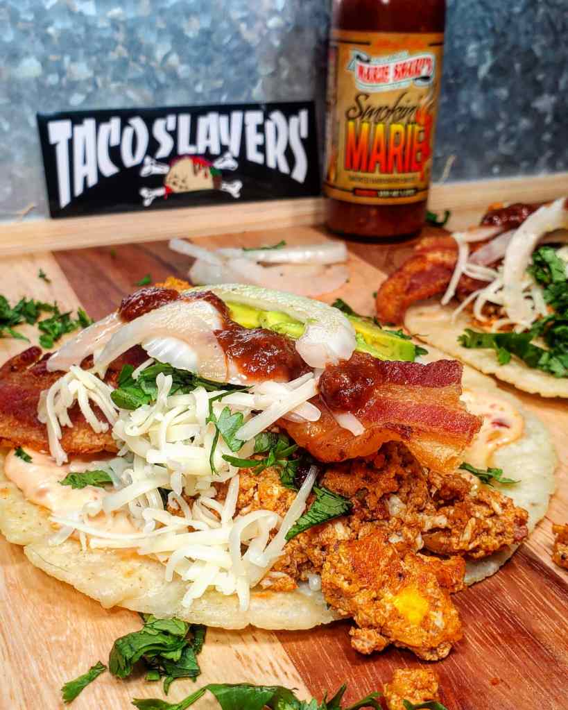 The tortillas were made with some left over nixtamal corn masa, simply the best vessel for these tacos. Once the tortillas were ready I spread in a chile paste and mayo concoction over the top where I’d lay in the chorizo and egg. Over the hot chorizo I sprinkled in shredded jack, cilantro, the bacon slices, onion and avocado slices. For the tasty finale I popped open a bottle of @mariesharpsusa SMOKER MARIE smoked habanero hot sauce to add some heat and that habanero tastyness.
