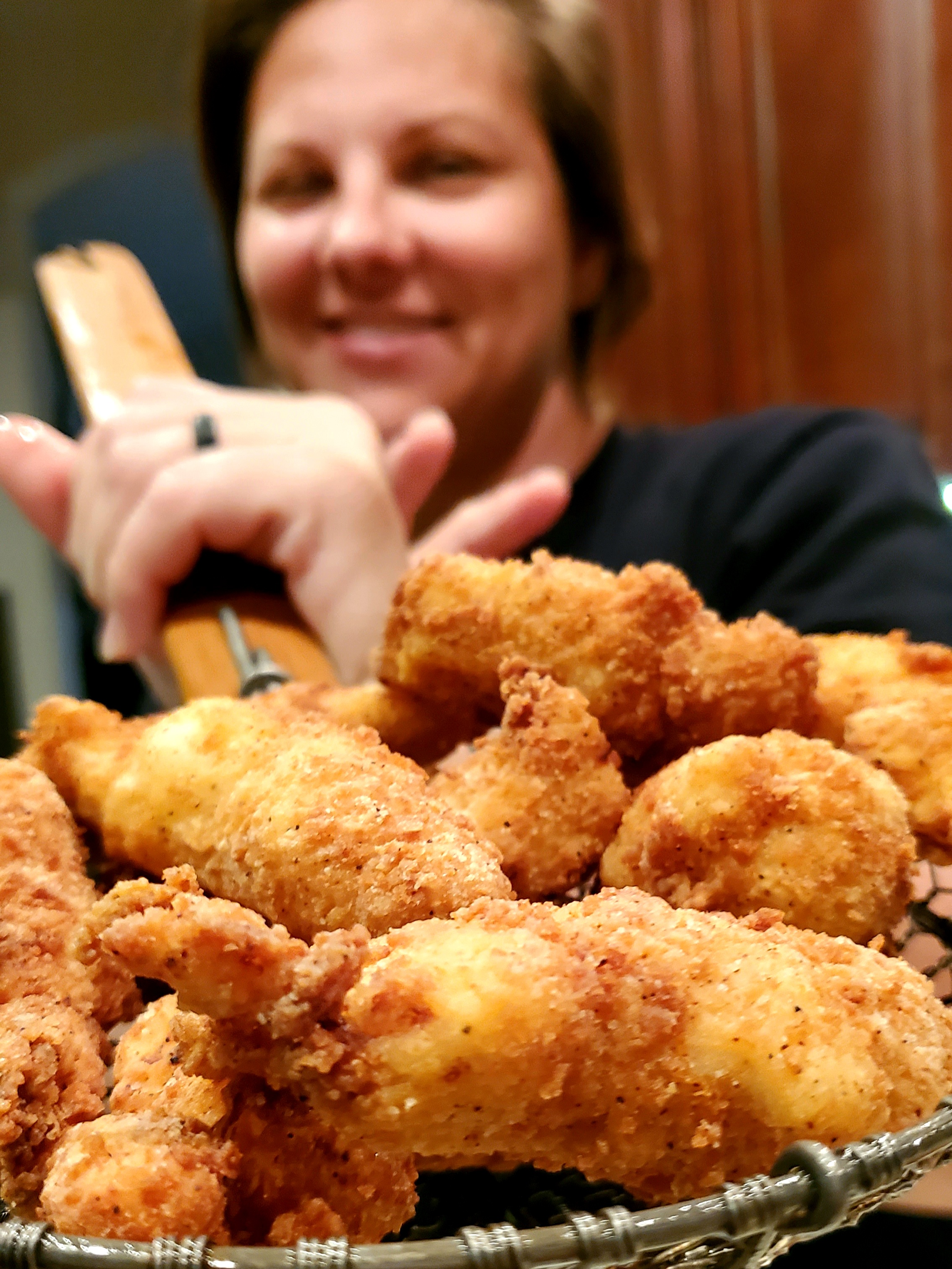 Once the slaw was completed we took the fish and dredged it into panko and flour batter with Cajon seasoning before frying them up.