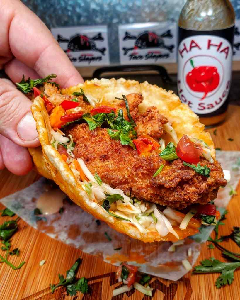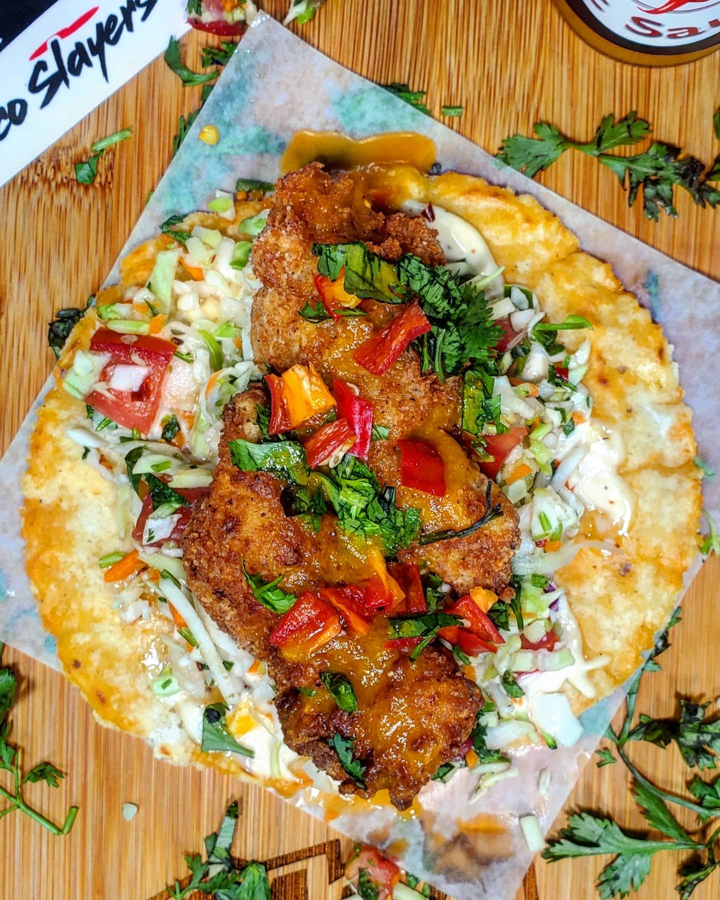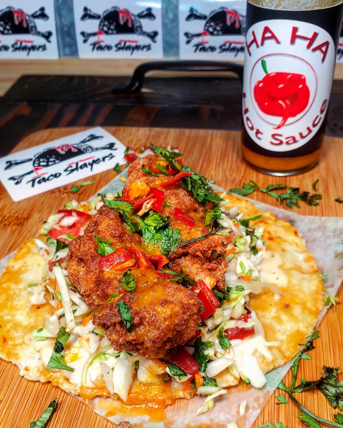 With a fresh homemade corn tortilla I scooped in some citrus slaw over a layer of spicy cream (sour cream, mayo, chile paste). Next I placed a couple pieces of our just-caught and fried catfish before finishing the taco off with cilantro, red bell peppers, and an extremely generous drizzling from the citrus and pepper heat of @hahahotsauce .