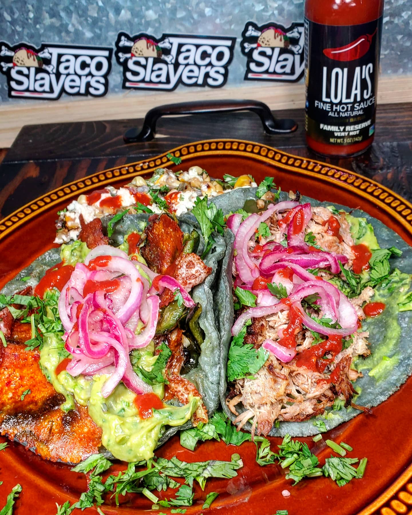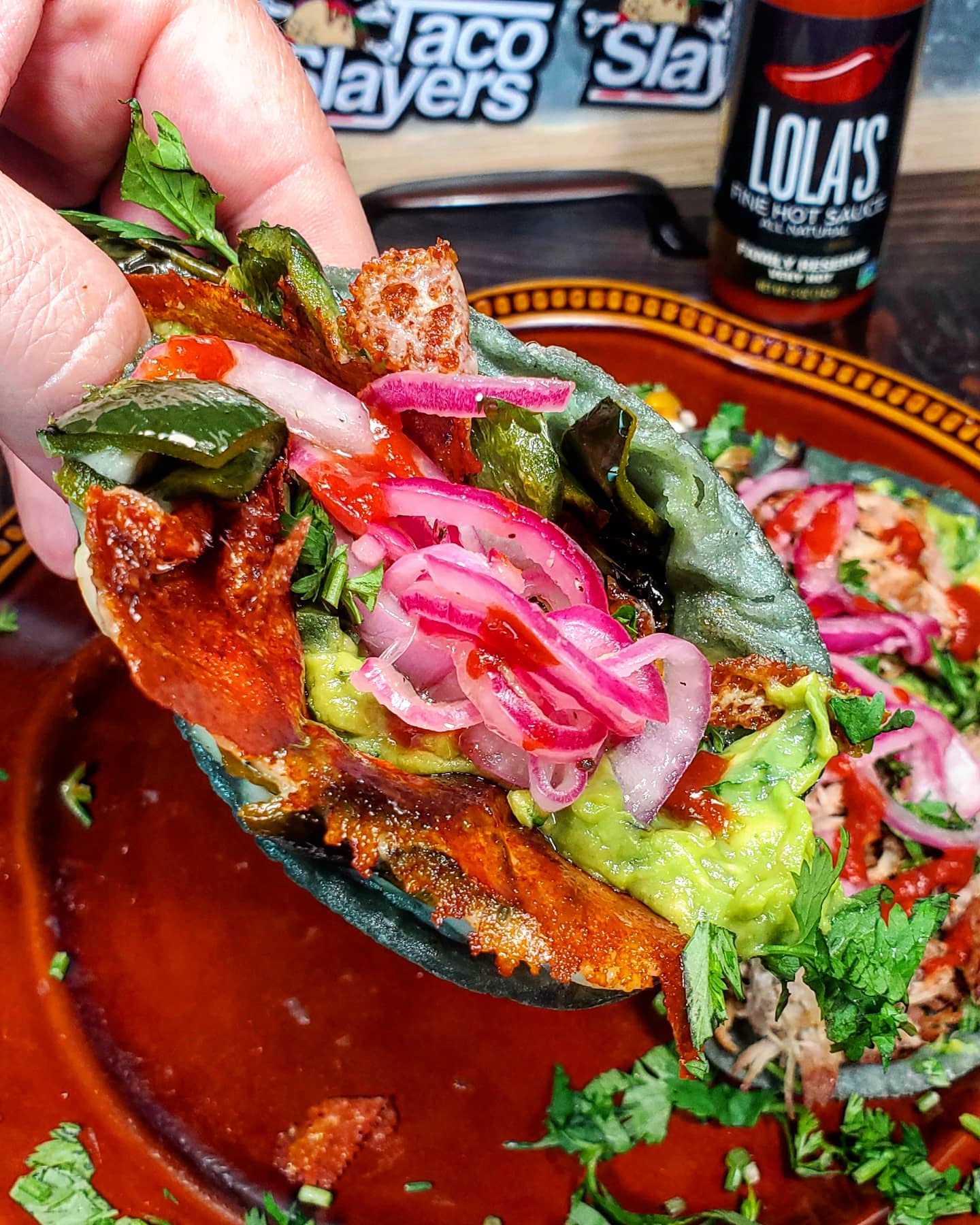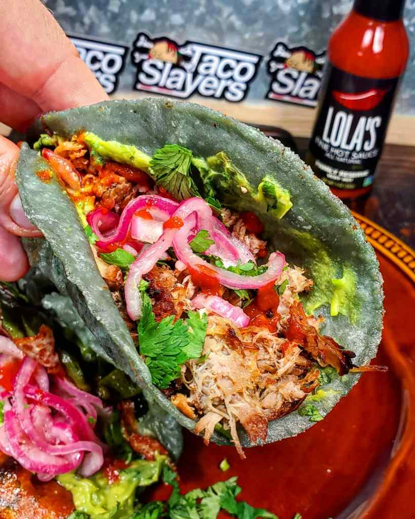 For the first taco I used a base layer of Guacamole over a blue corn tortilla to hold in the massive scoop of carnitas. Next I simply added in some pickled onions and cilantro.