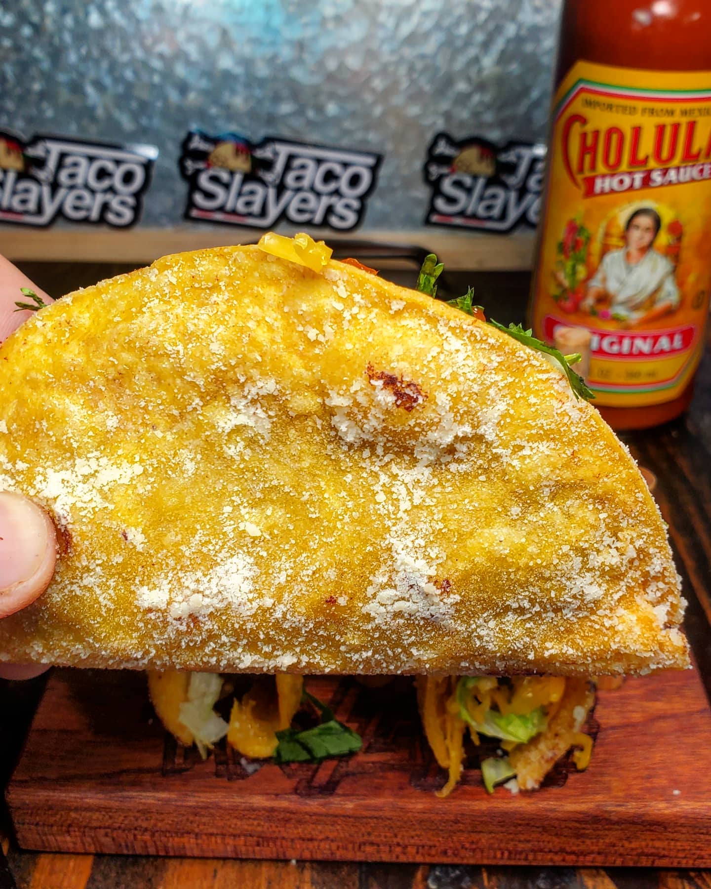 The idea is to place raw seasoned ground beef into a tortilla and fry it until the meat is cooked and the tortillas are crispy. Once my tacos are fried up I dust the outsides in parmesan before I add in all the toppings: lettuce, tomato, onion, cheese, cilantro and for these tacos copious amounts of @cholulahotsauce …