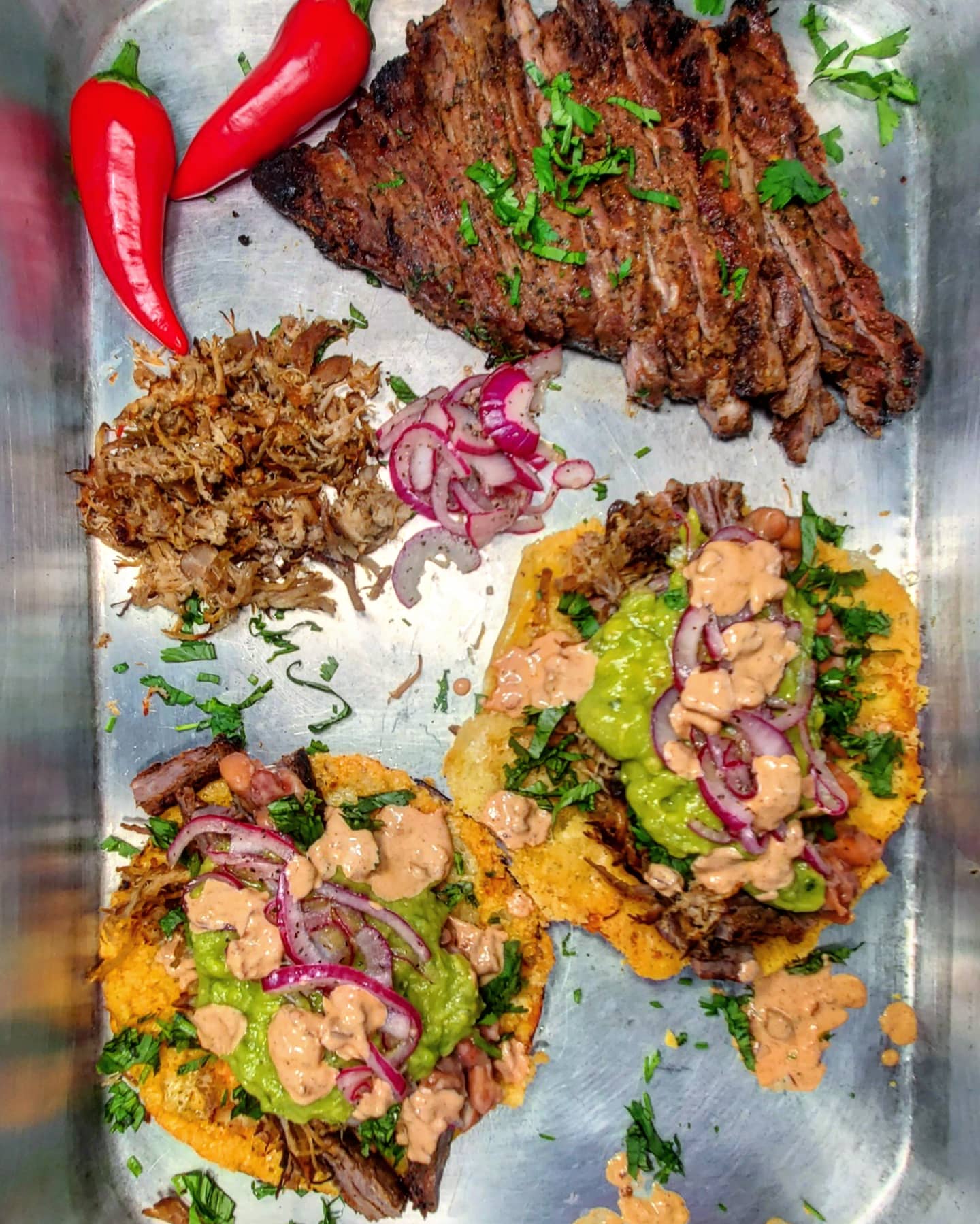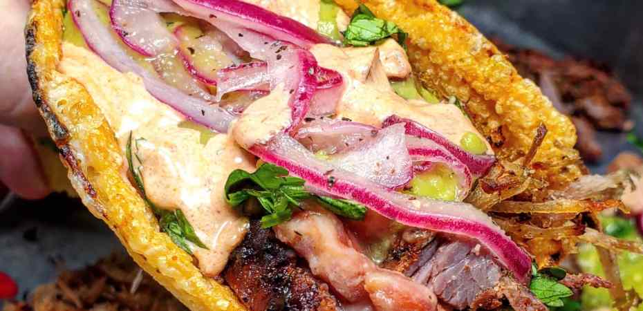 This taco is topped in cilantro, homemade guac, picked red onions and final power slam of a homemade spicy chipotle crema.