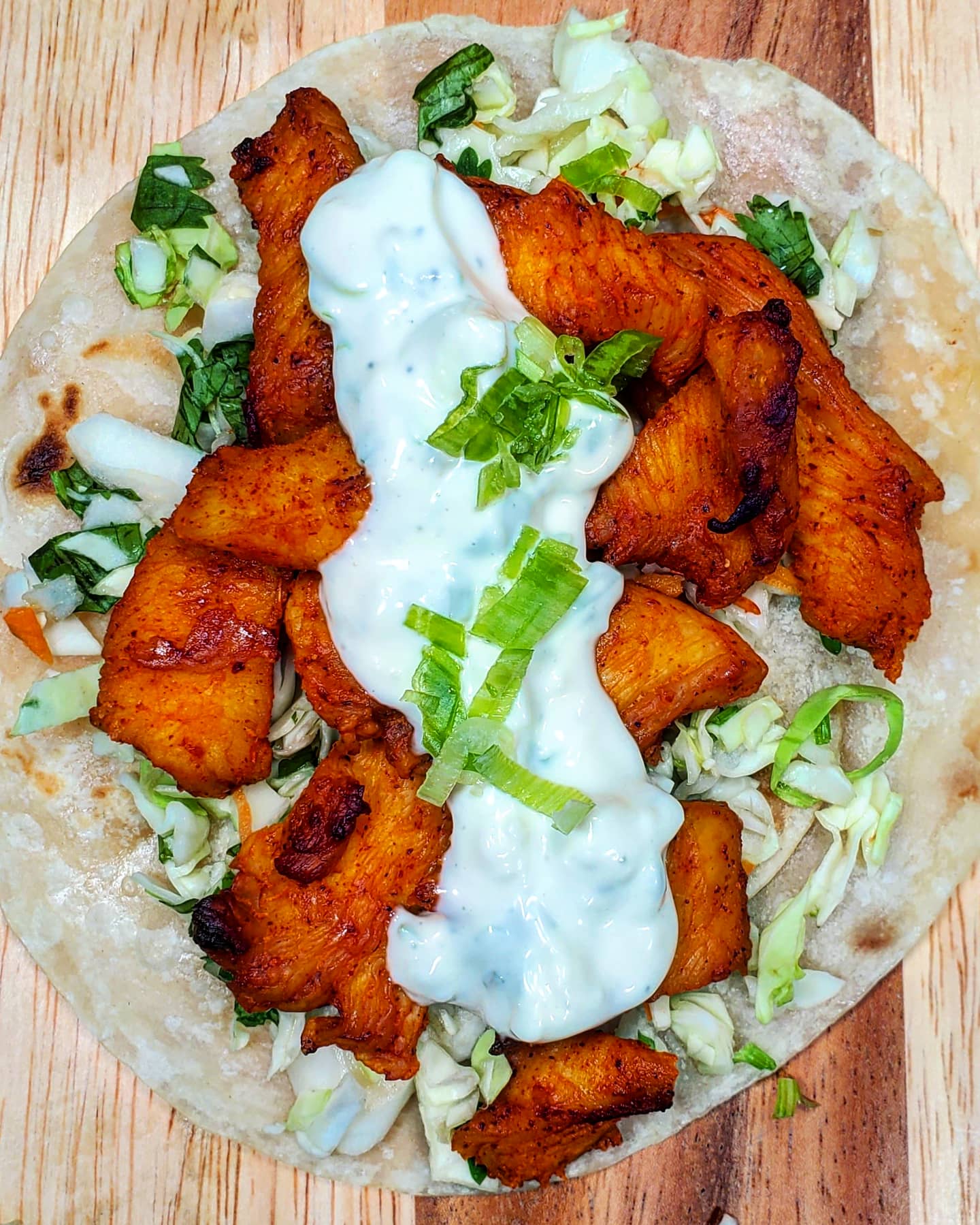 Next I combined a cup of chopped cabbage with a 1/4 cup of cilantro and mixed together with a splash of rice vinegar and salt. Finally everything came together over a flour tortilla in just under 30 min and it was killer.
