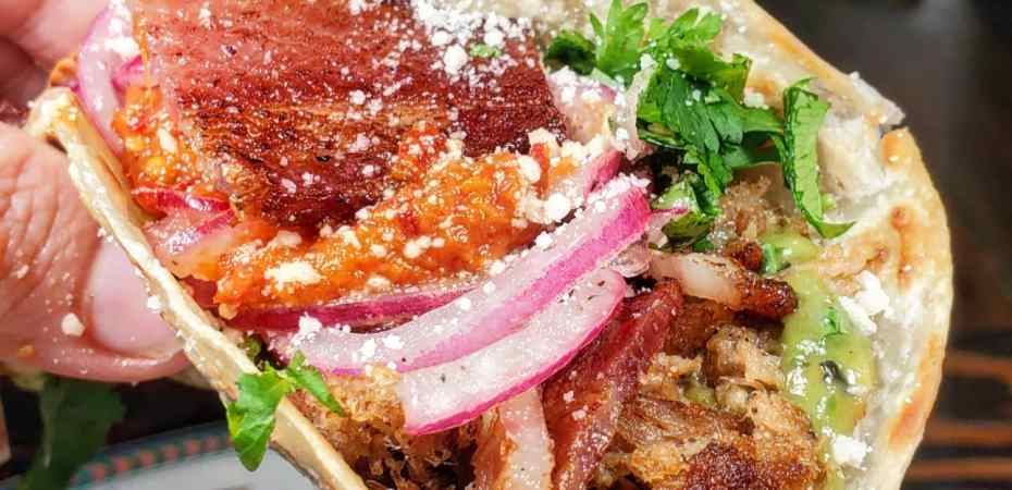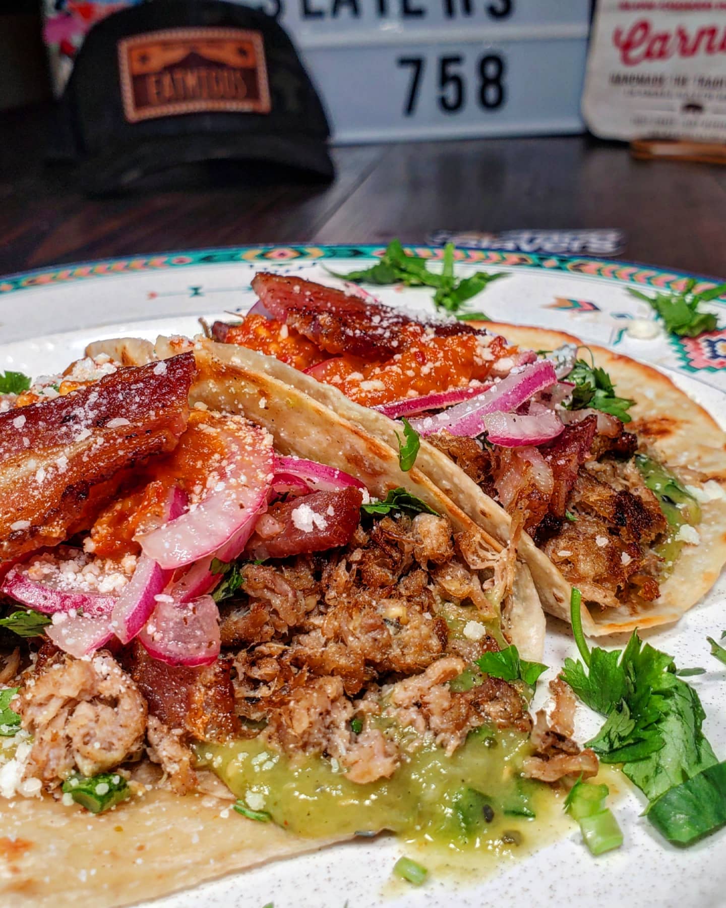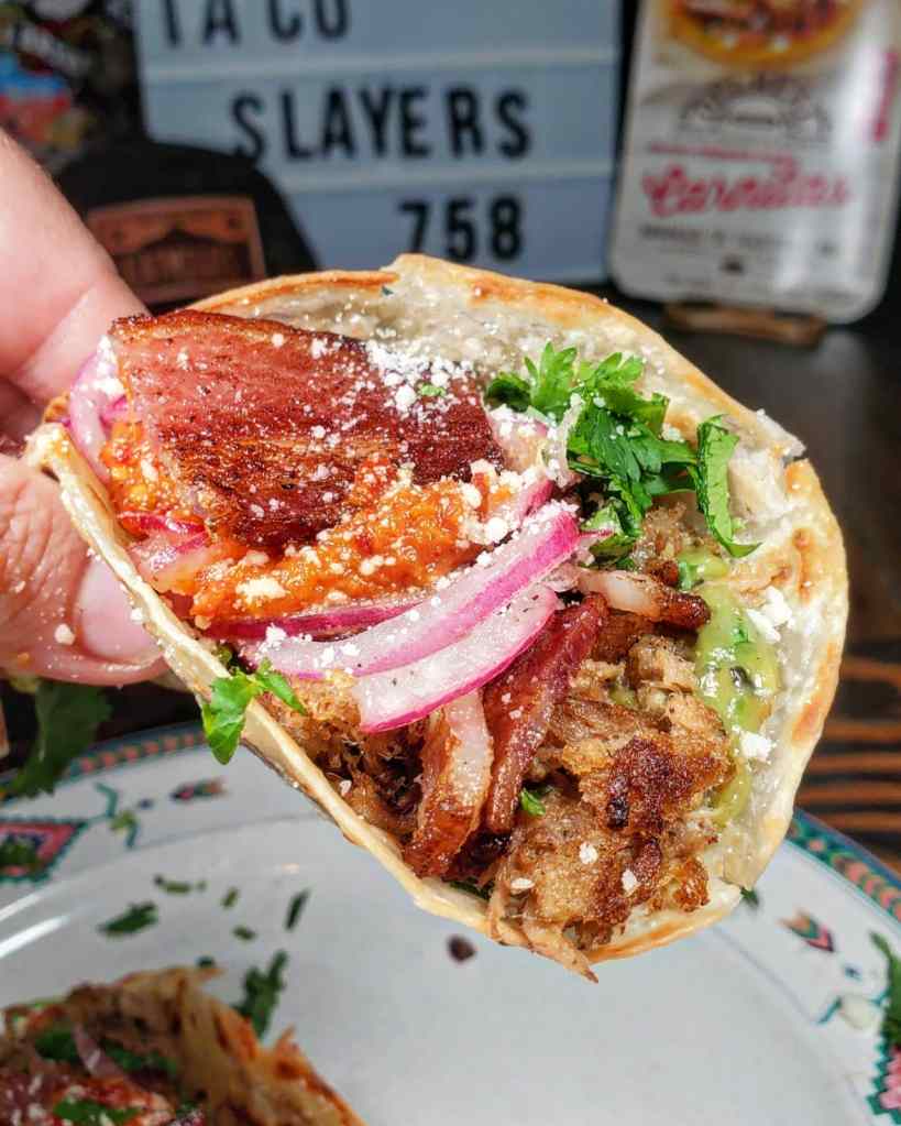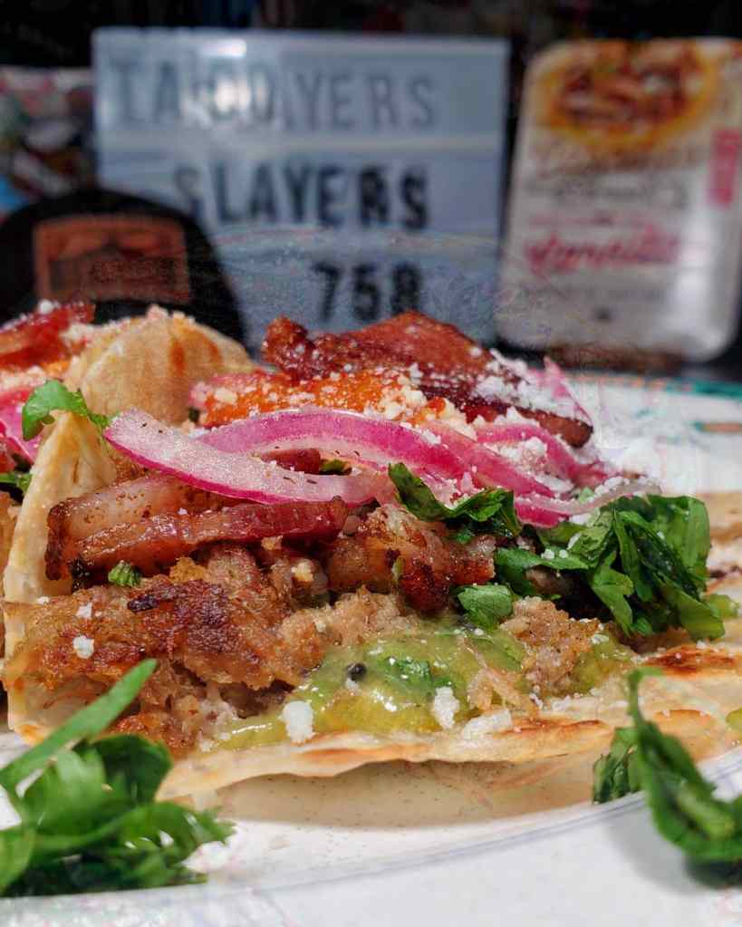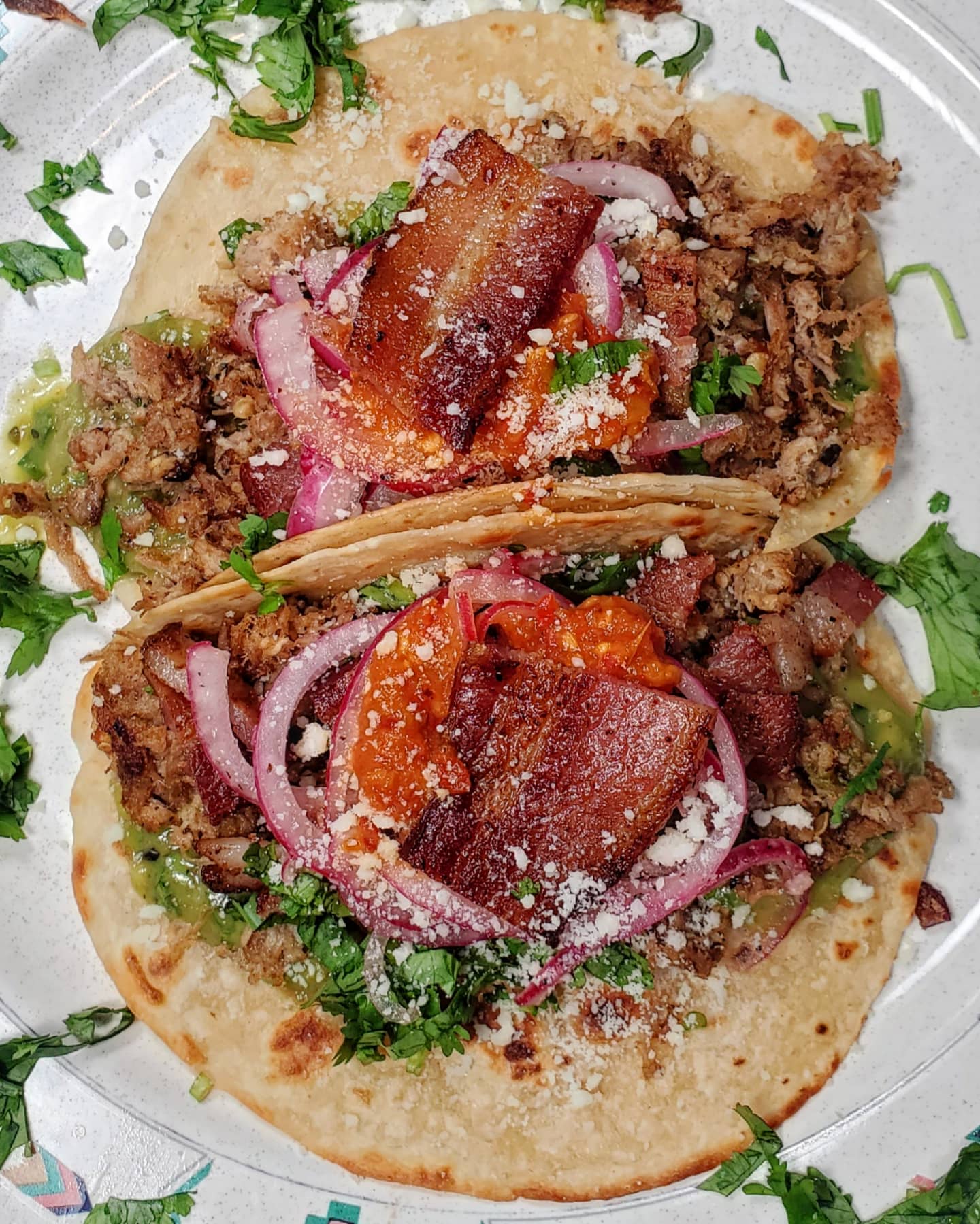 With the meat warmed and cooked I heated up some @elcomalproducts flour tortillas with guacamole and salsa verde before squeezing my meats(carnitas & bacon) in. Next I dropped in the cilantro and pickled red onions followed by a generious scoop of my homemade garden habanero sauce and cojita cheese.