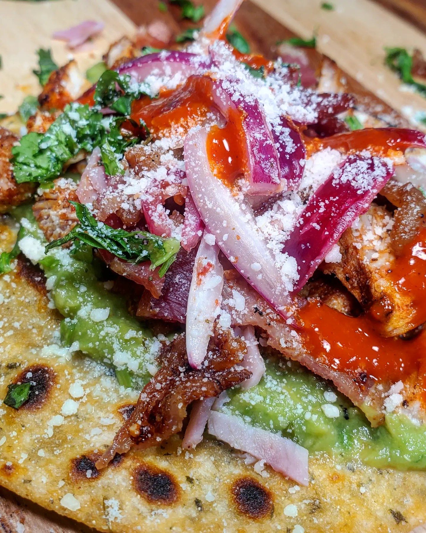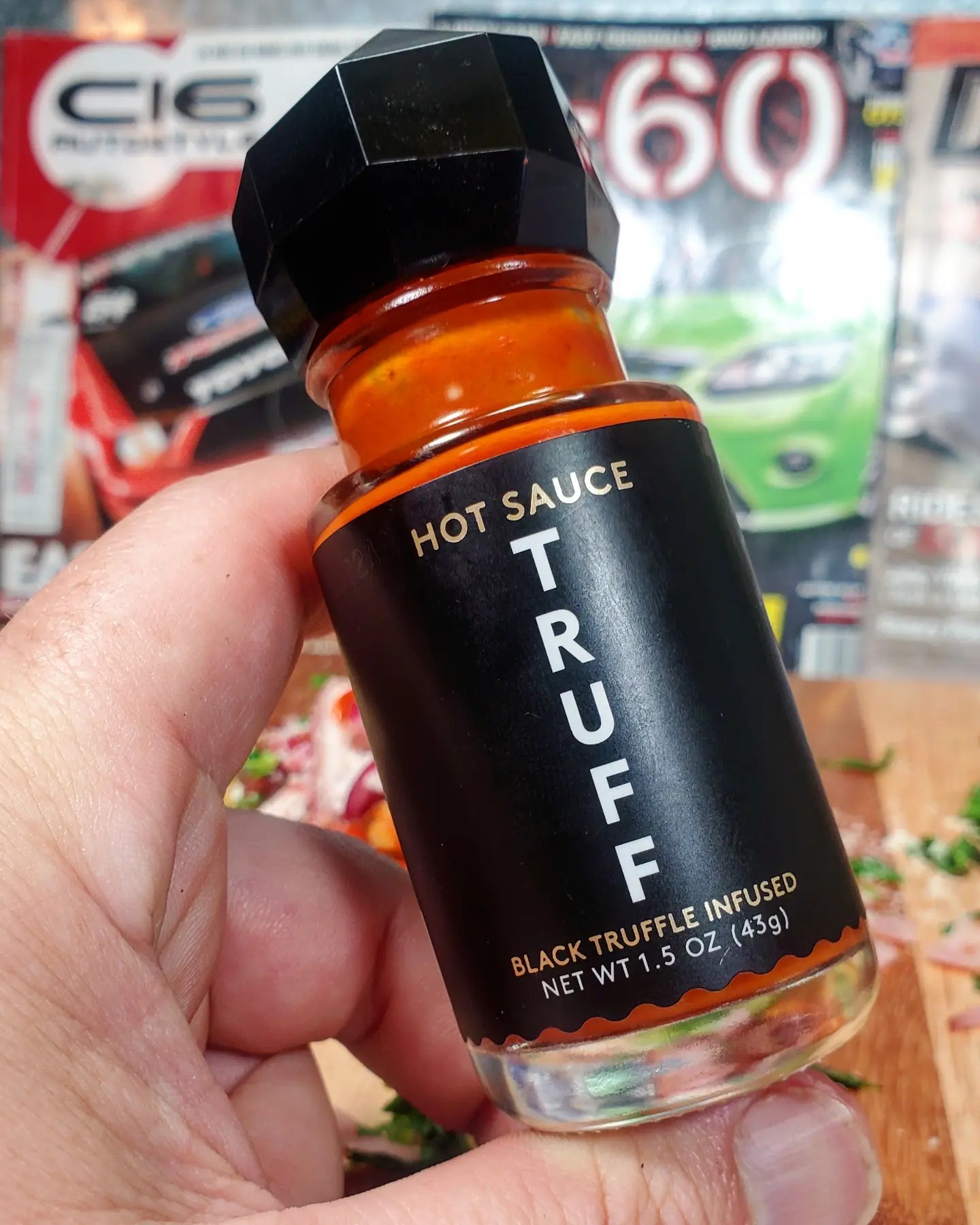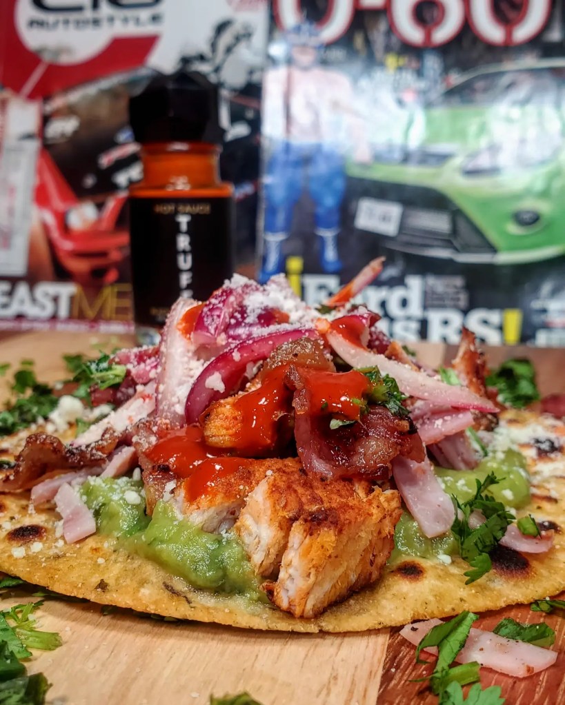After grilling up all my meats on the CharBroil i stacked them in this corn tortilla over a heaping mound of guacamole. First the adobada, then the grilled ham, followed by bacon. Next a little cilantro, pickled red onions, and cotija cheese before finishing them off with a solid drizzling of the Truff @sauce .