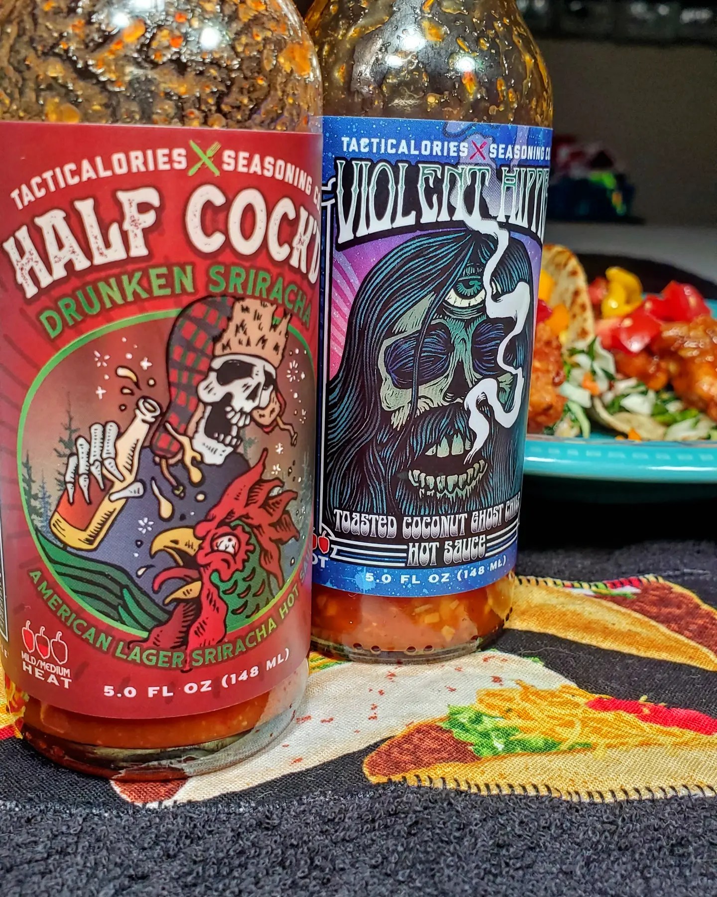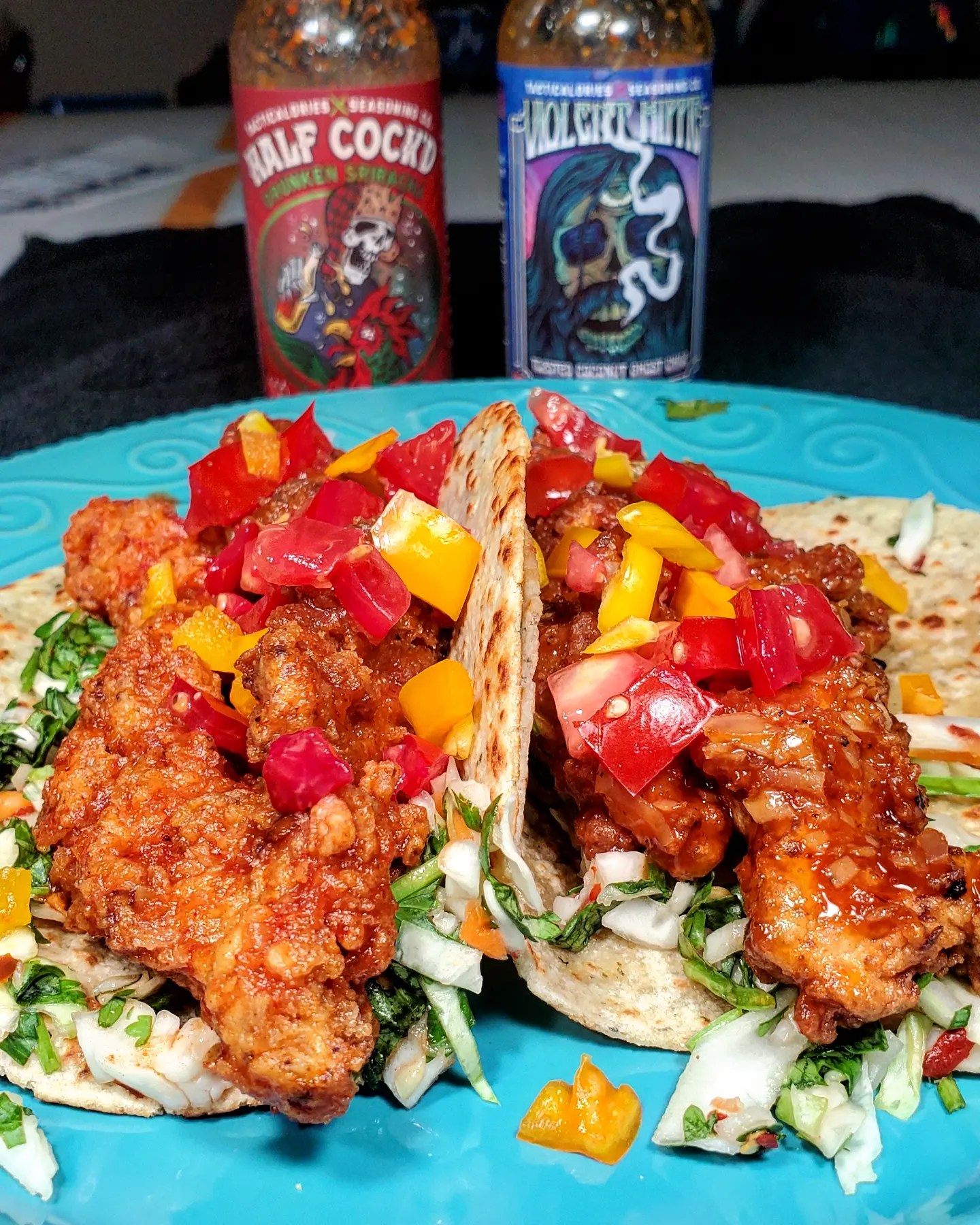 We used some hybrid flour/corn tortillas and added a scoop of cabbage cilantro slaw before piling in the chicken. I used 2 different sauce to coat the chicken. The first taco was coated in HALF COCKED Drunken Sriracha and the second was coated in VIOLENT HIPPIE Toasted Coconut & ghost pepper.