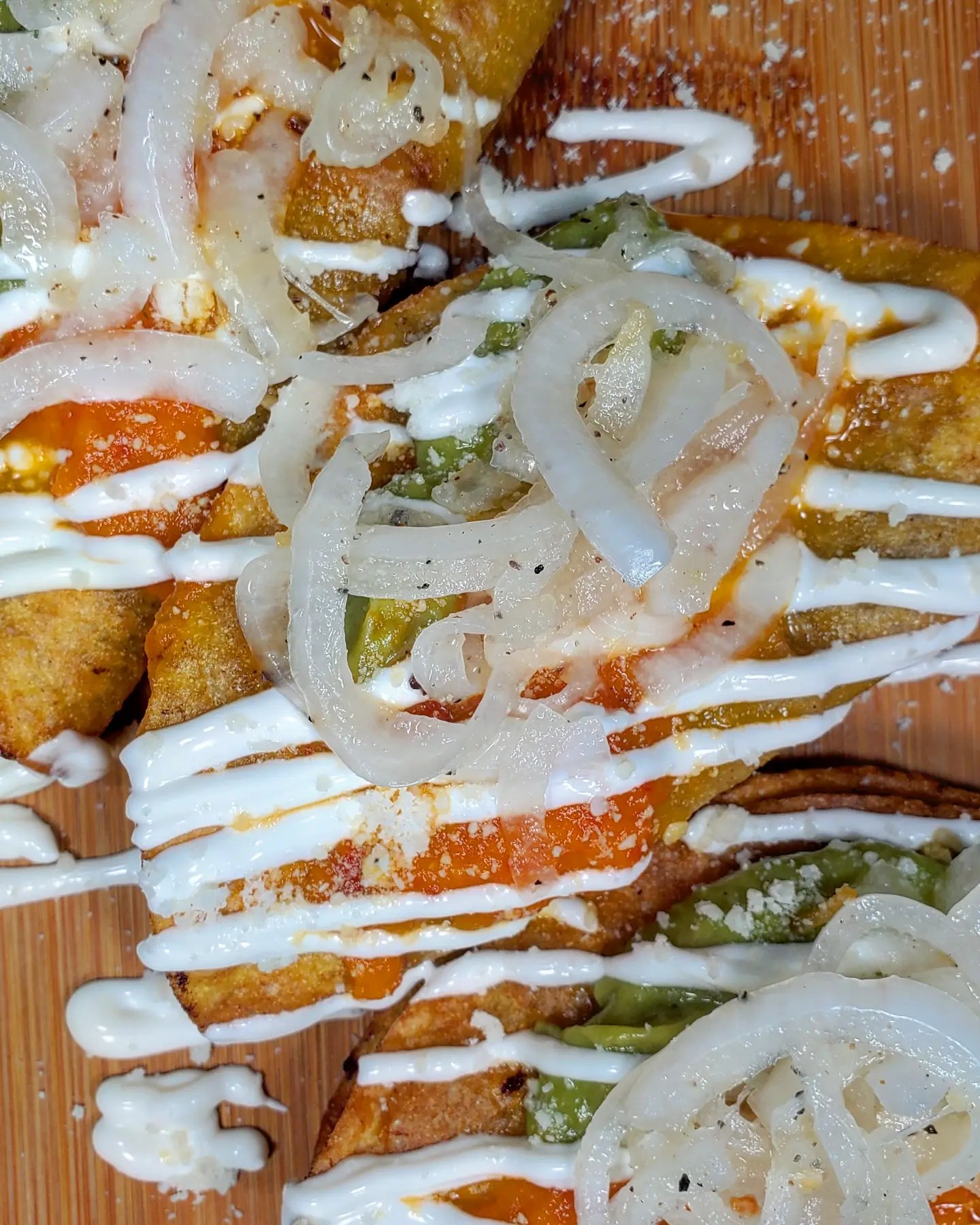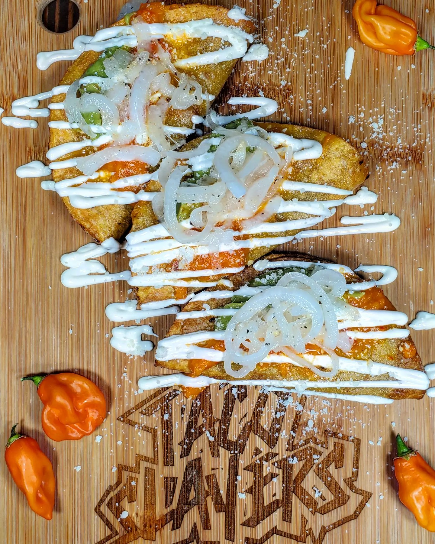For the tacos i placed a layer of seasoned ground beef into a fresh @elcomalproducts corn tortilla and fried them up. Once crispy, i piled on the habanero sauce, @yucatanguac , crema, cotija and some vinegar soaked white onions. I topped this off with a few drops of reaper sauce from @mikeyvshotsauce . Boom.