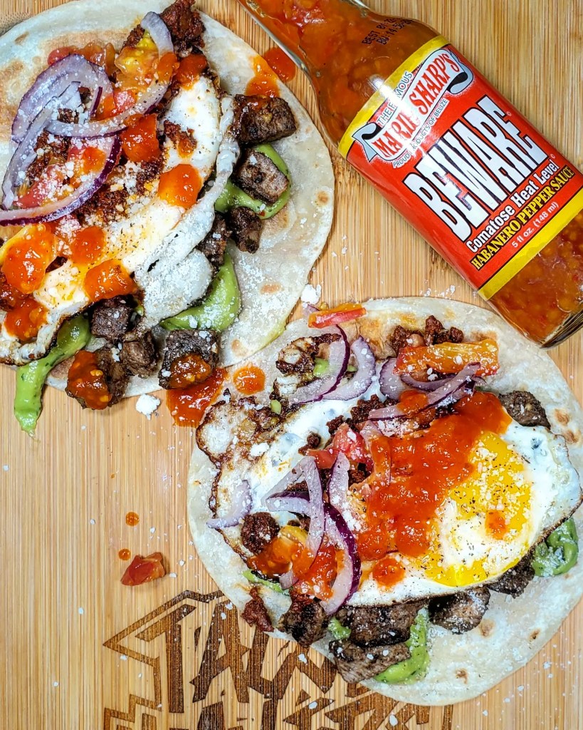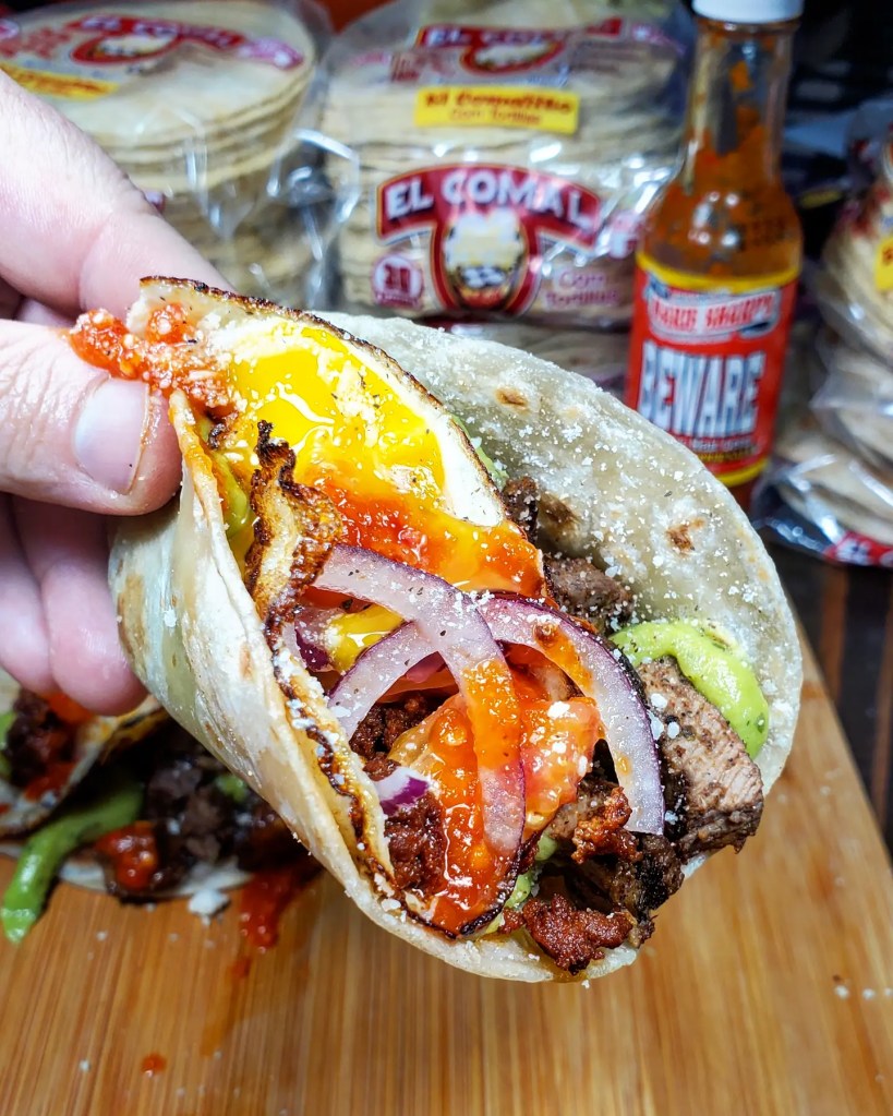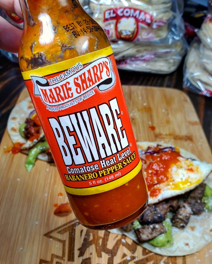 On an @elcomalproducts flour tortilla we piled in some @yucatanguac , steak, chorizo, a fried egg, onion, tomato and copious amounts of @mariesharpsusa BEWARE hot sauce.