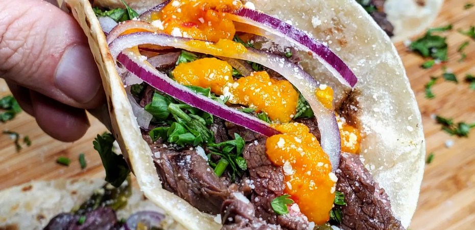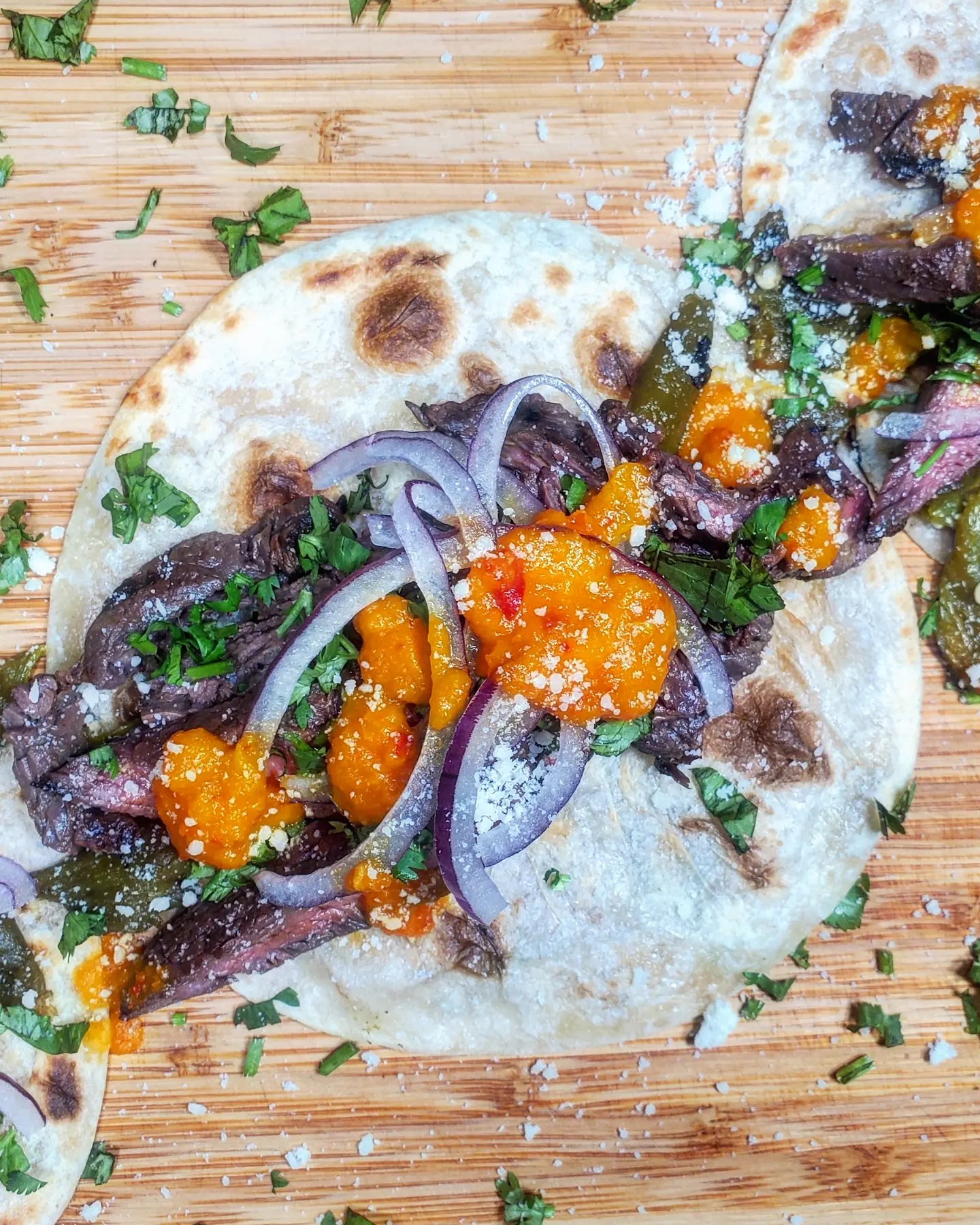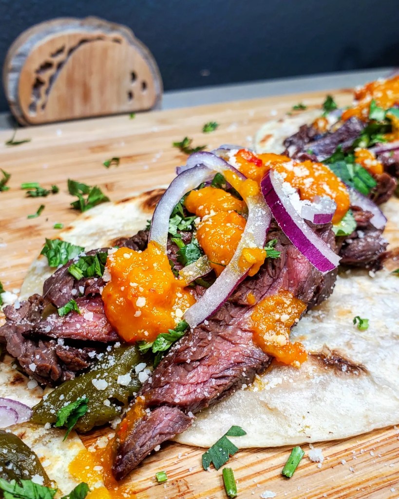 We cooked the beef over the fire of my @charbroilgrills before warming up my hatch chiles and chopping up red onions and cilantro. The base of these tacos would be an El Comalito flour tortilla from @elcomalproducts.
