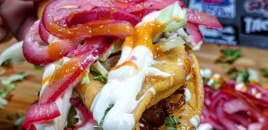 First I sliced up some red onions and mixed them with lime juice, pepper, salt and garlic salt. Next I chopped up a little green cabbage. Lastly I placed some carnitas in a tortilla and into some hot oil for a few moments until the tortillas were crispy. After pulling them out of the oil I placed them on to a cutting board and laid down the layers of sour cream, cabbage, cilantro, and the lime soaked red onions.