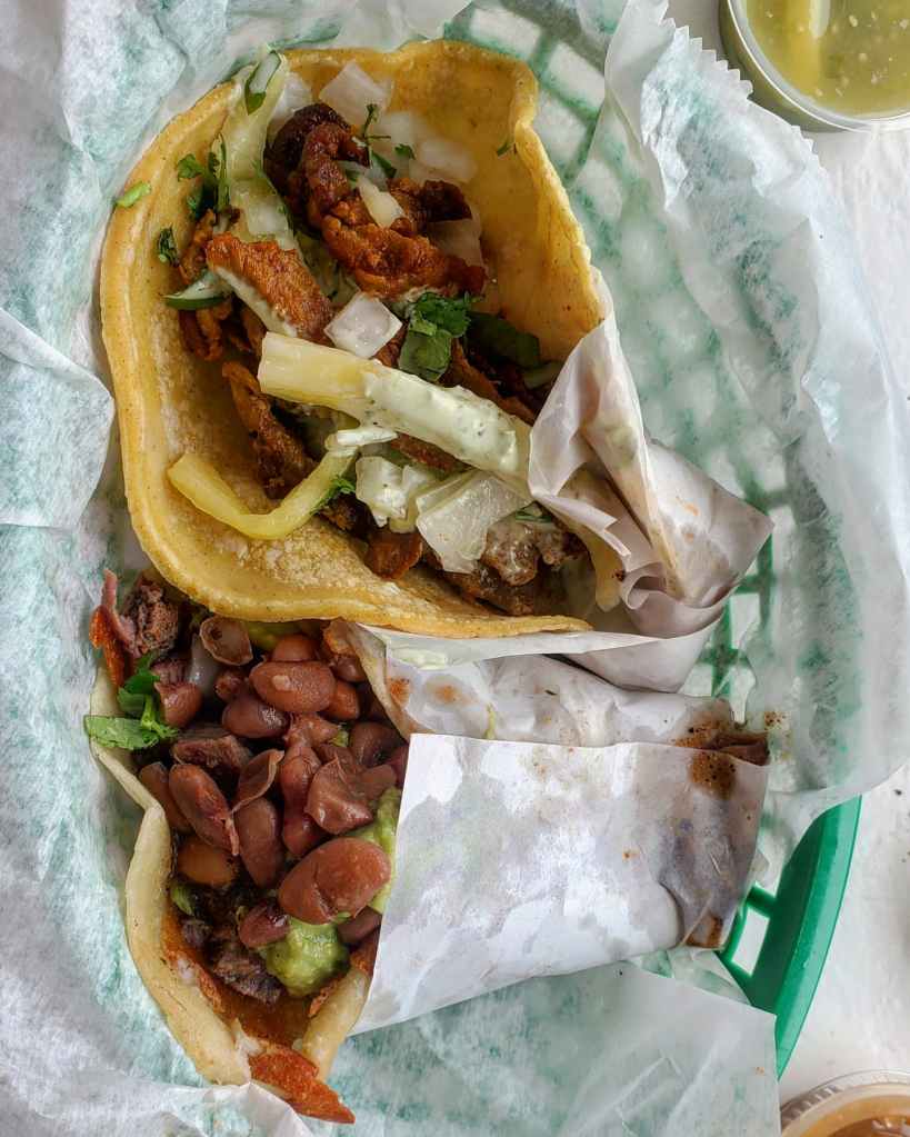 The al pastor came straight off a trompo and was piled onto a fresh hand made corn tortilla with cilantro, onions, pineapple as well as an cream sauce.