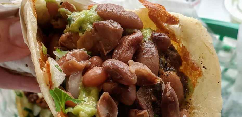 The Sonora Taco started off as a hand made flour tortilla packed with a crispy cheese layer, carne asada, beans, cilantro, onions, & guacamole.