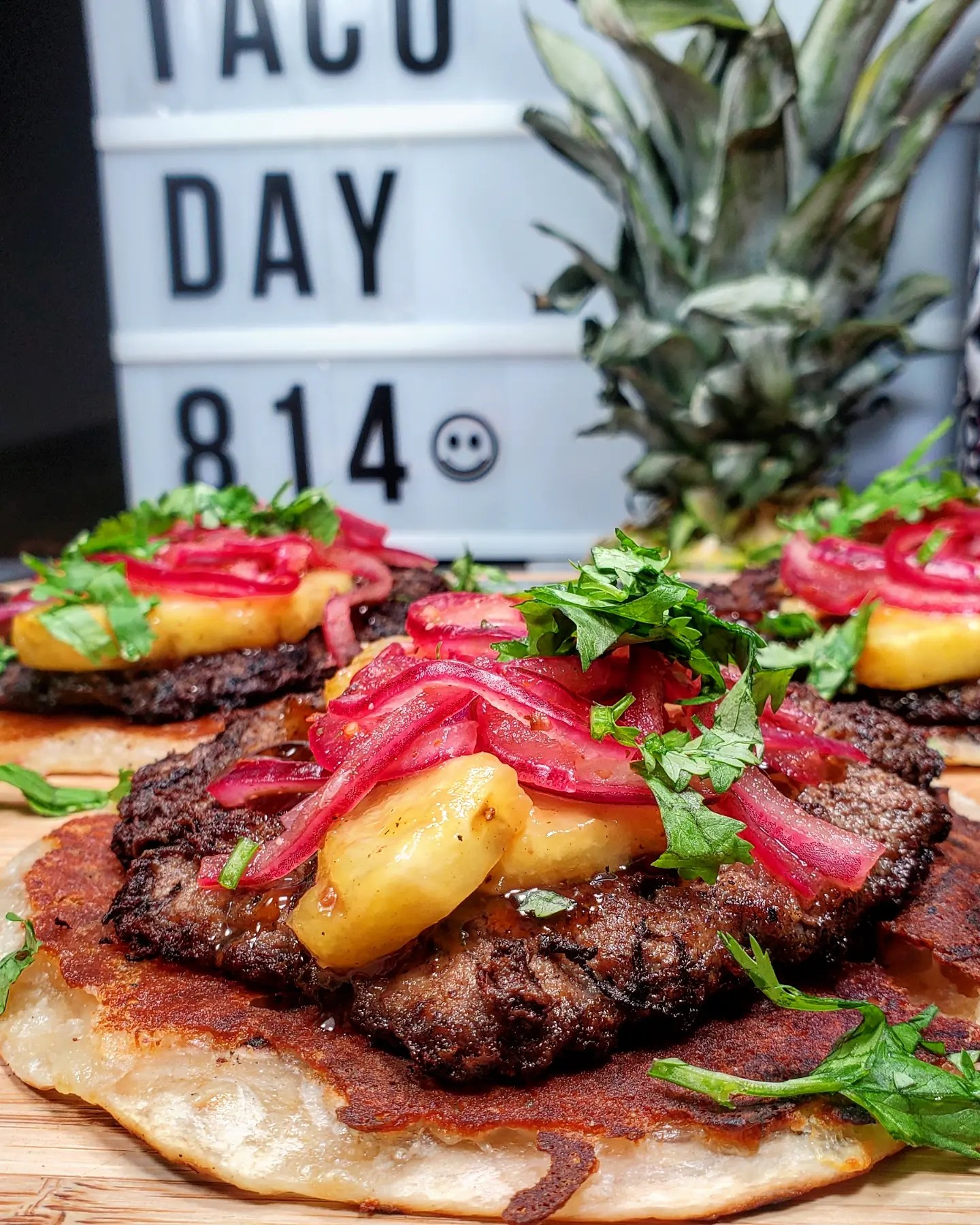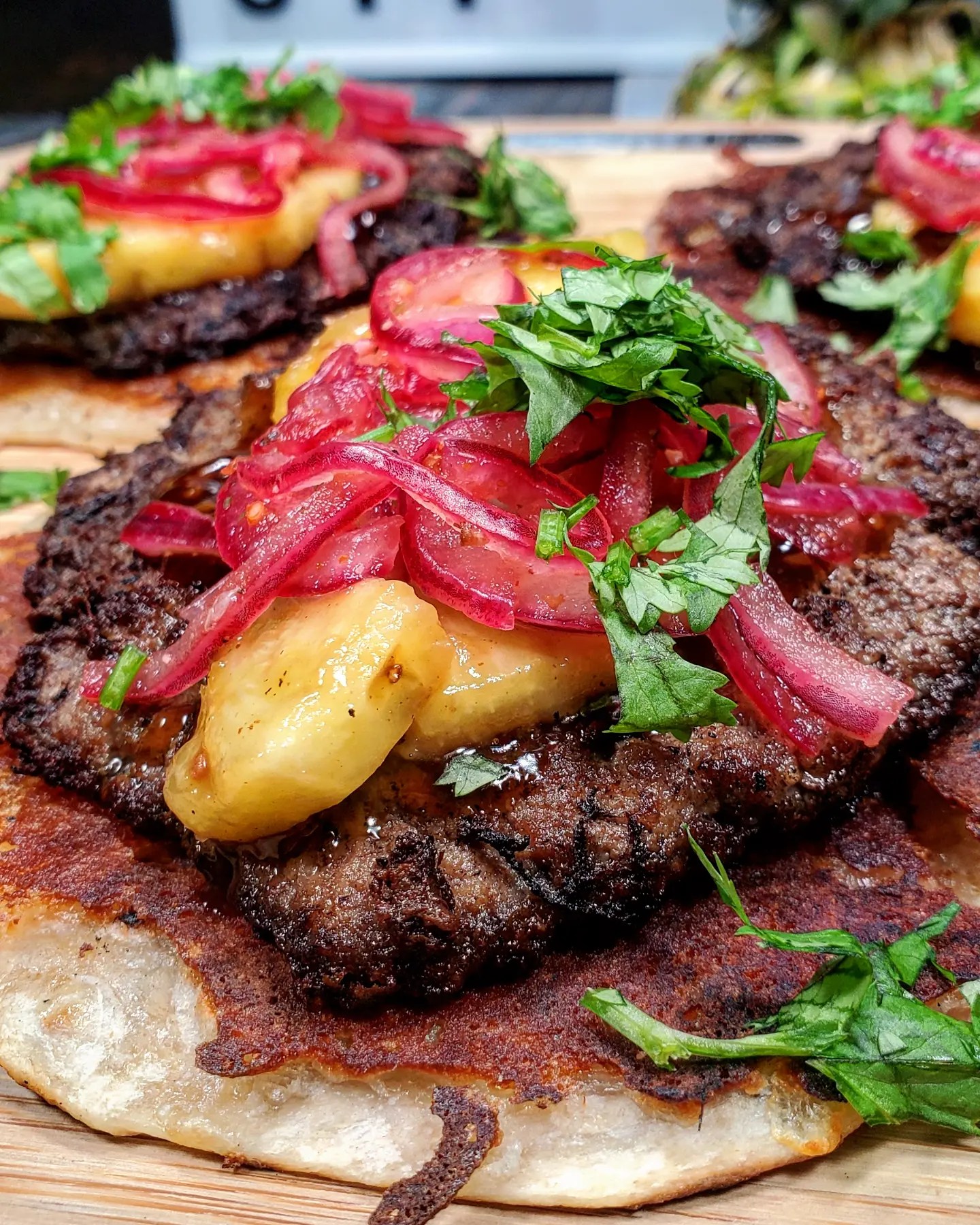 Teriyaki and street taco spices. After cooking up the patties I chopped up a pineapple and cooked up some chunks with @kinderssauce Teriyaki sauce recommended from my home girl Tori. Next I heated up flour tortillas on a comal and melted a little cheese over the top where I placed the meat. The sweet grilled pineapple slices came next followed by a few pickled red onions and a dusting of cilantro.