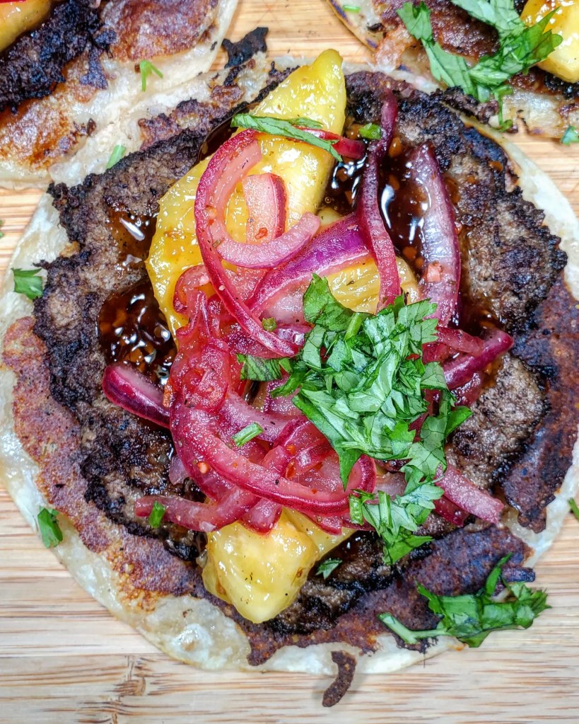 The other day I was making smash burgers for family and I stuffed a few patties into a tortilla with Teriyaki sauce, pineapple, cilantro, and red onions. They were sooooo darn tasty and while in the moment I did it on the fly, I really wanted to revisit those tacos and give them a proper go.