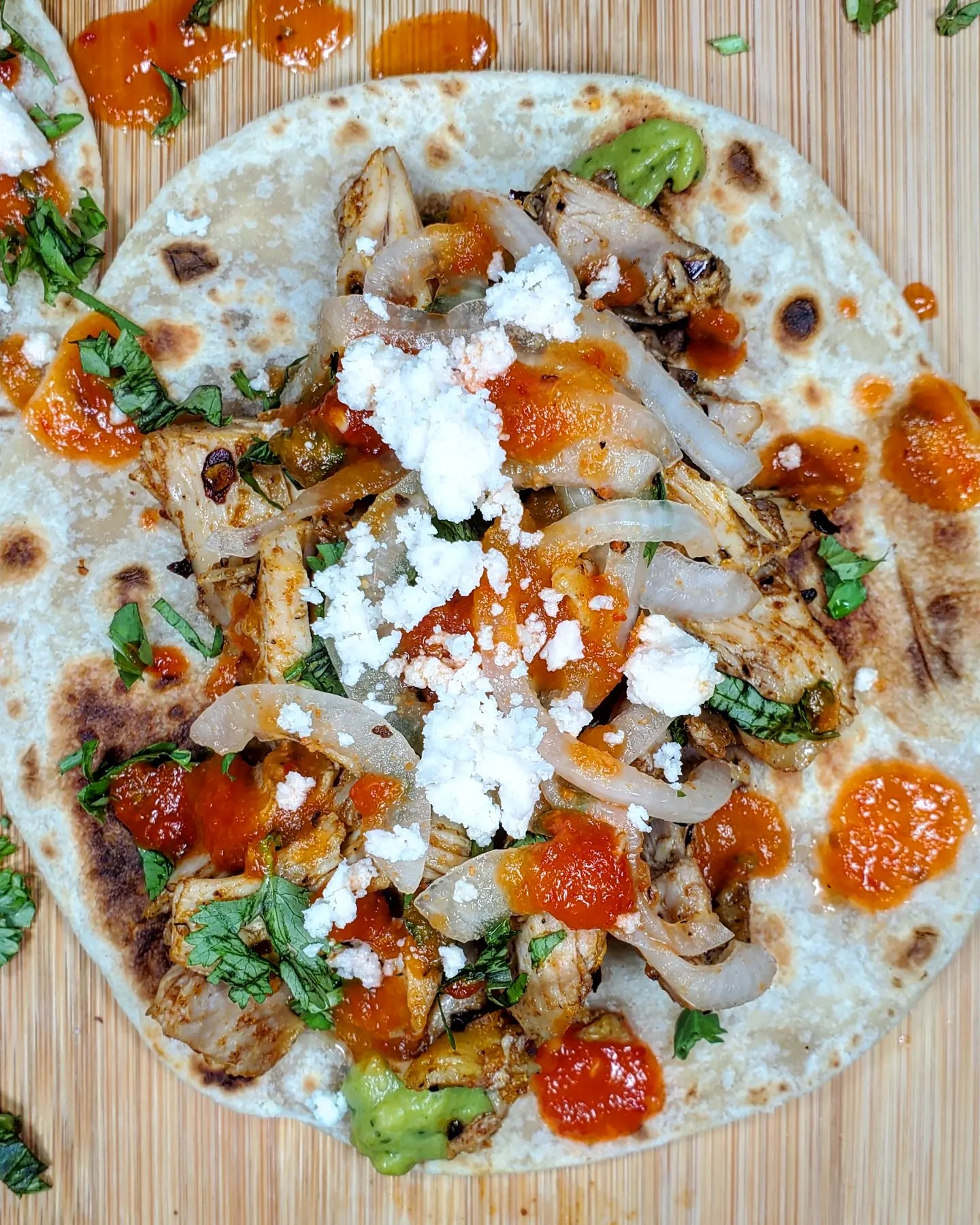 After breaking down the chicken I dropped it into a flour tortilla from @elcomalproducts with guacamole from @yucatanguac , cilantro, onions, queso fresco and a few dabs of @mariesharpsusa