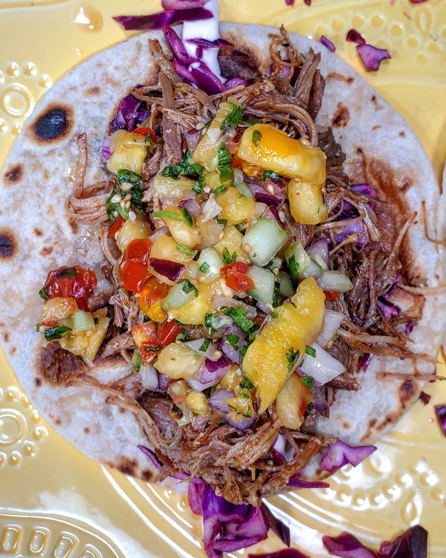 Next I warmed up flour tortillas and piled in the deliciousness. First a layer of sour cream, followed by a little red cabbage and the meat. I slapped in a mountain on pulled pork and capped it off with the pineapple salsa.