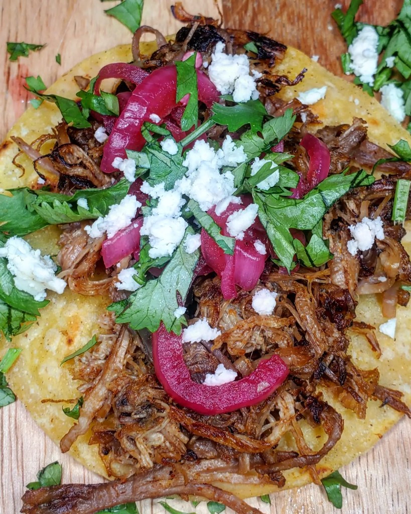 Warmed up a quick round of pulled pork Tacos from the leftovers we made yesterday. They went down super easy with cilantro topped over pickled onions, queso fresco and a few drops of @magohotsauce. Everything was piled deep inside a few corn tortillas from @elcomalproducts