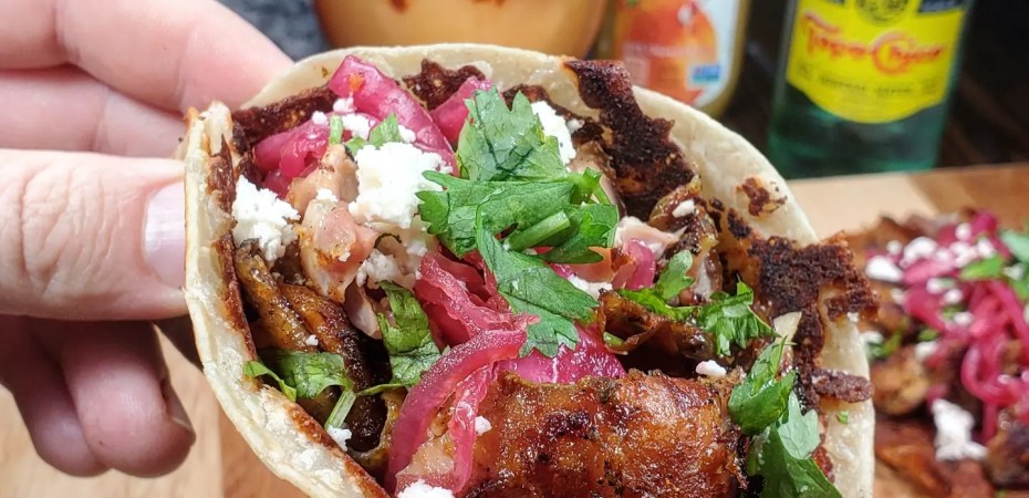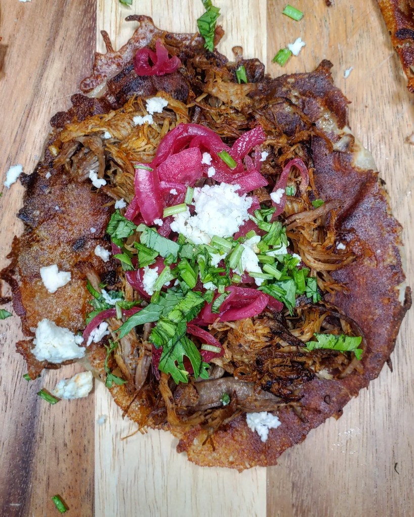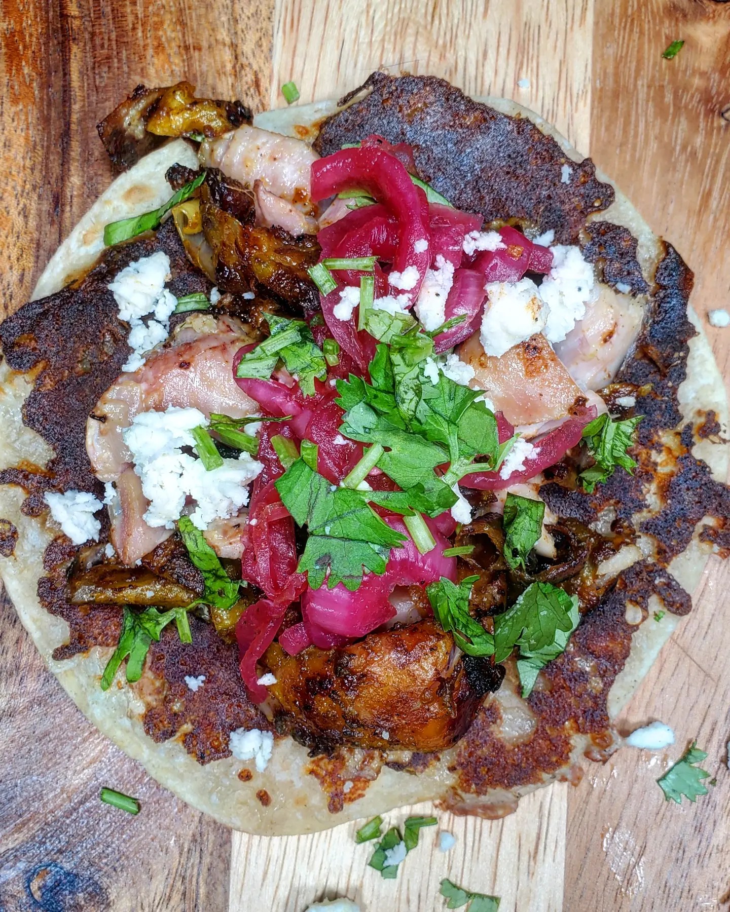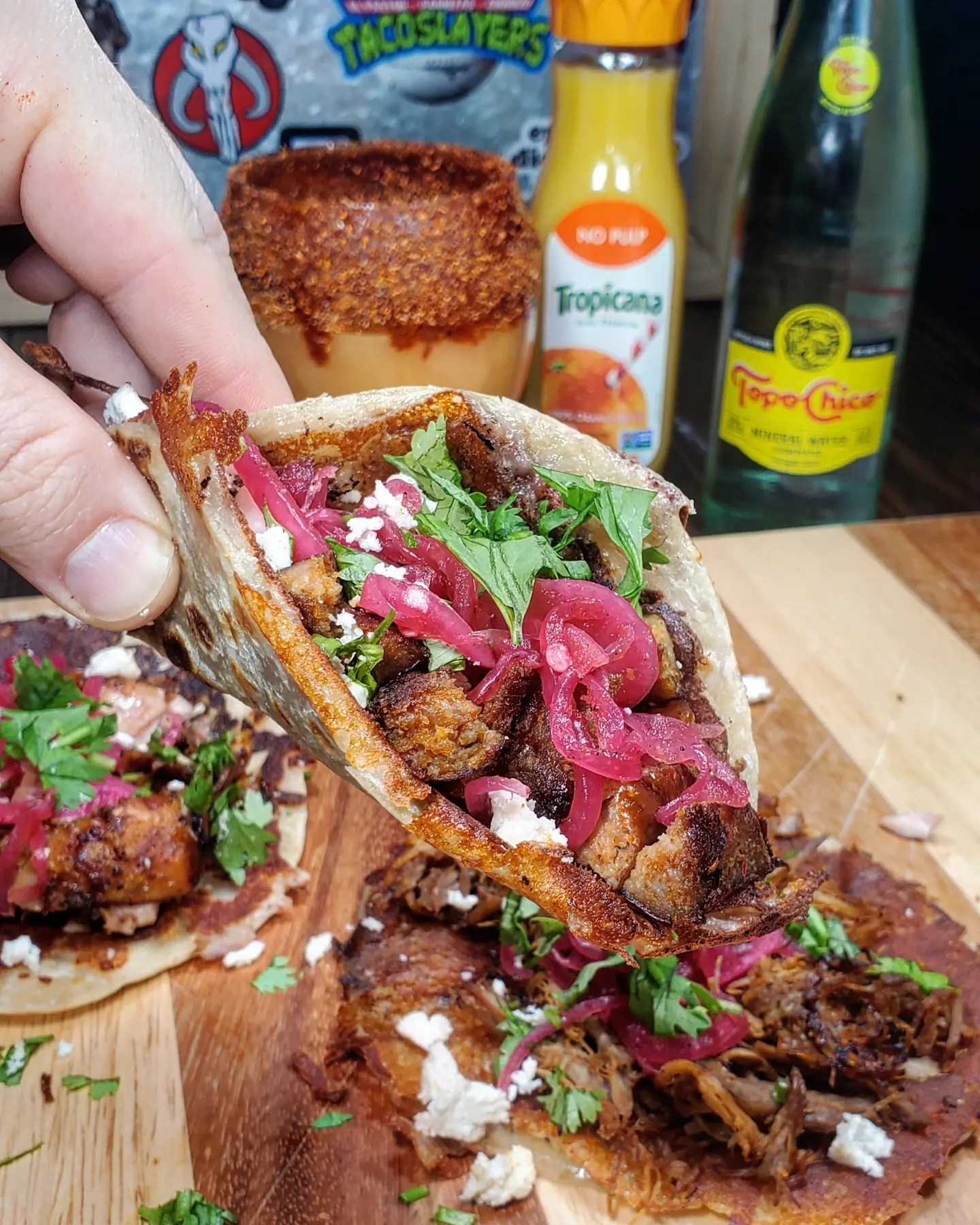 Each taco came complete with a flour tortilla with a cheesy overlay, meats, cilantro, onion, and queso fresco.