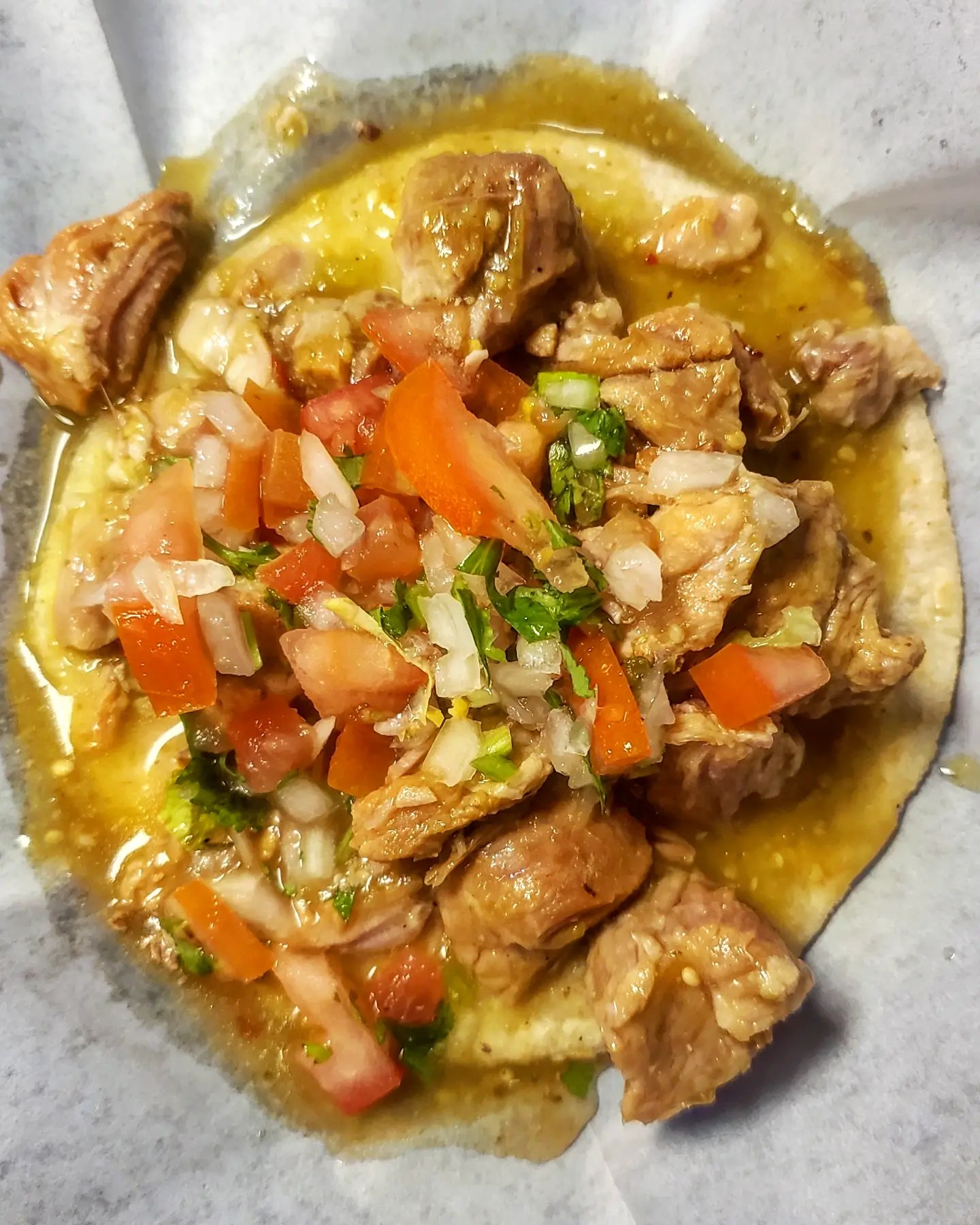 The green taco is a chile verde taco served up wet with green sauce soaking into the tortilla and huge chunks of slowcooked pork scattered over the top. After a scoop of pico de gallo is placed they serve it to you and OMG its so good althougg it’s best to not waist any time and eat it right when it comes to your plate.