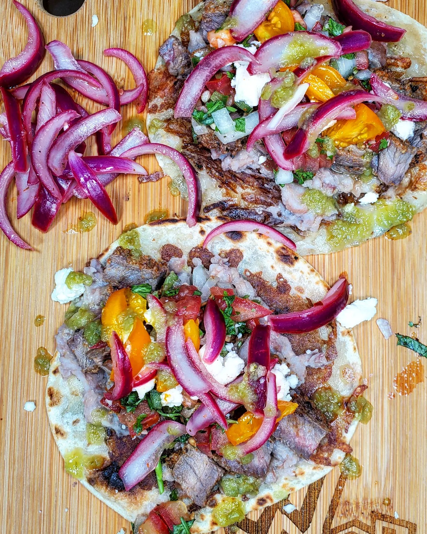 I used a flour tortilla and coated one side of it in cheese followed by a generious helping of refried beans. Next I piled in the steak, the pico, red onions, queso fresco and several drops of @mariesharpsusa