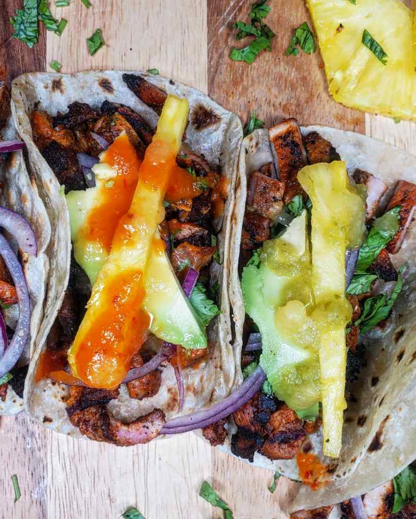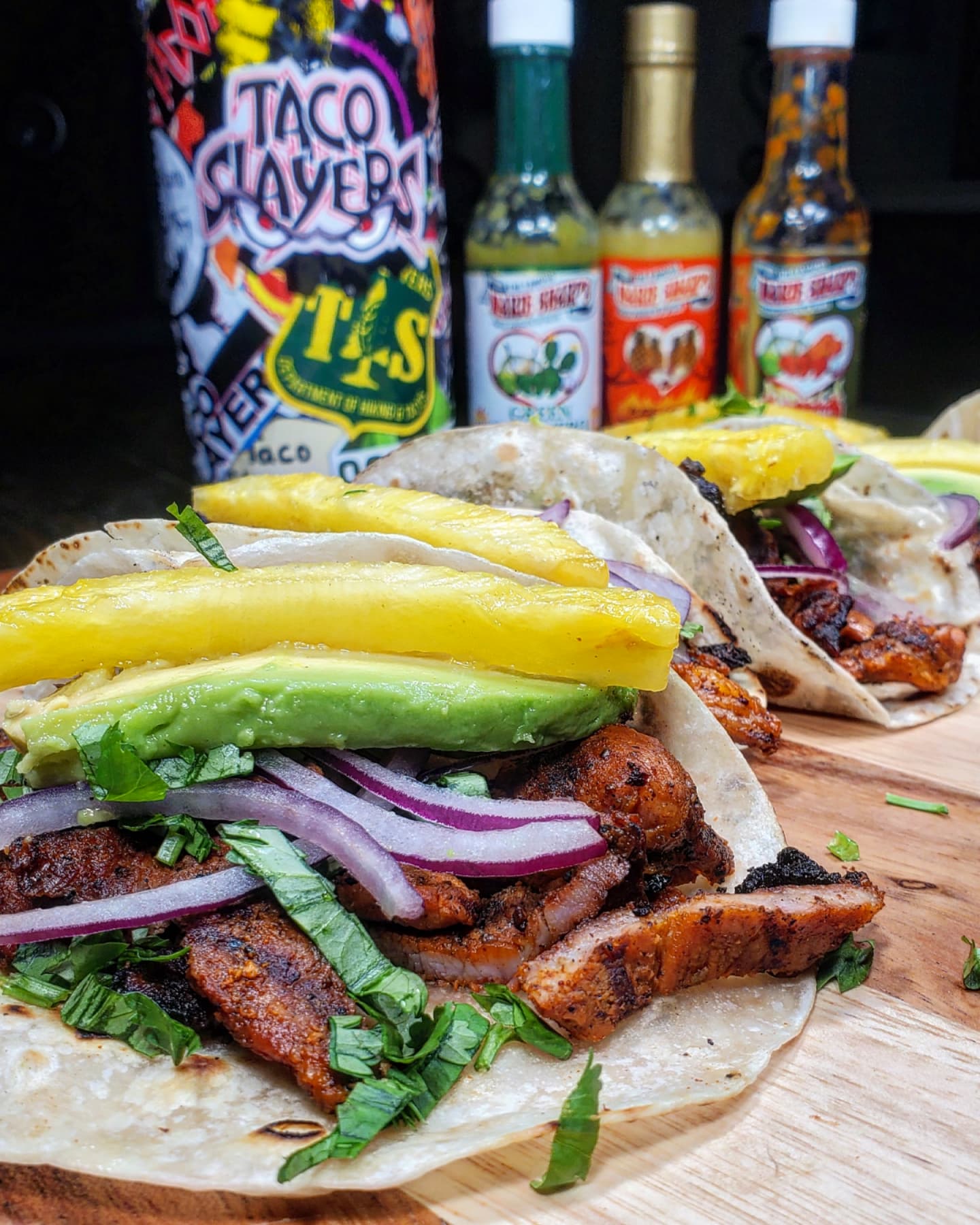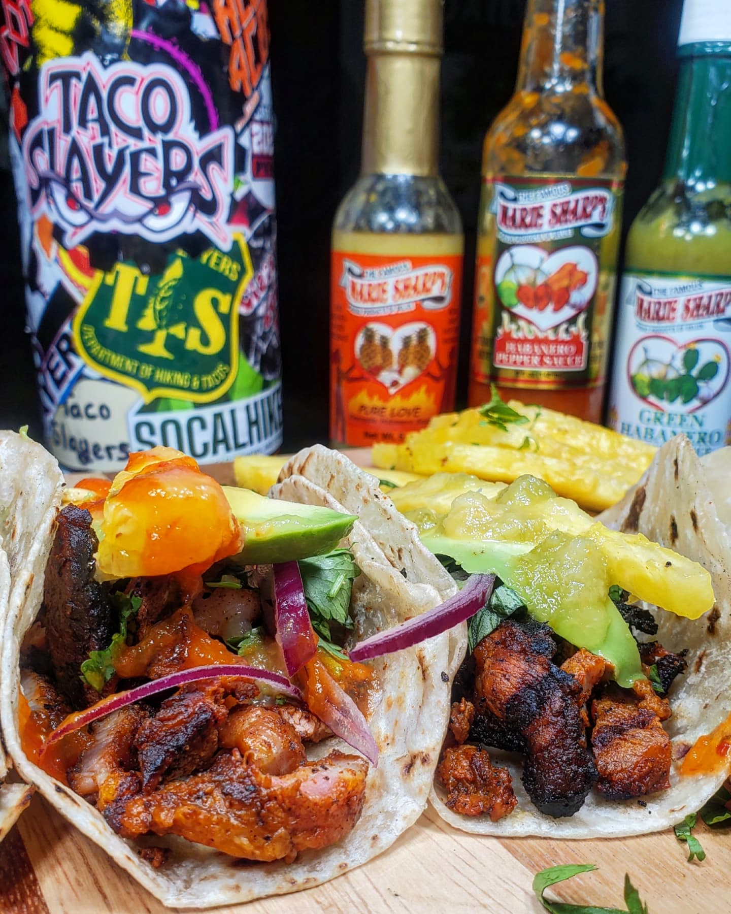 Once back home, I grilled up the adobada over the fire contained in my @charbroilgrills. After chopping up pineapple, cilantro and onion I loaded each taco up with COPIOUS AMOUNTS of @mariesharpsusa Hot sauces.