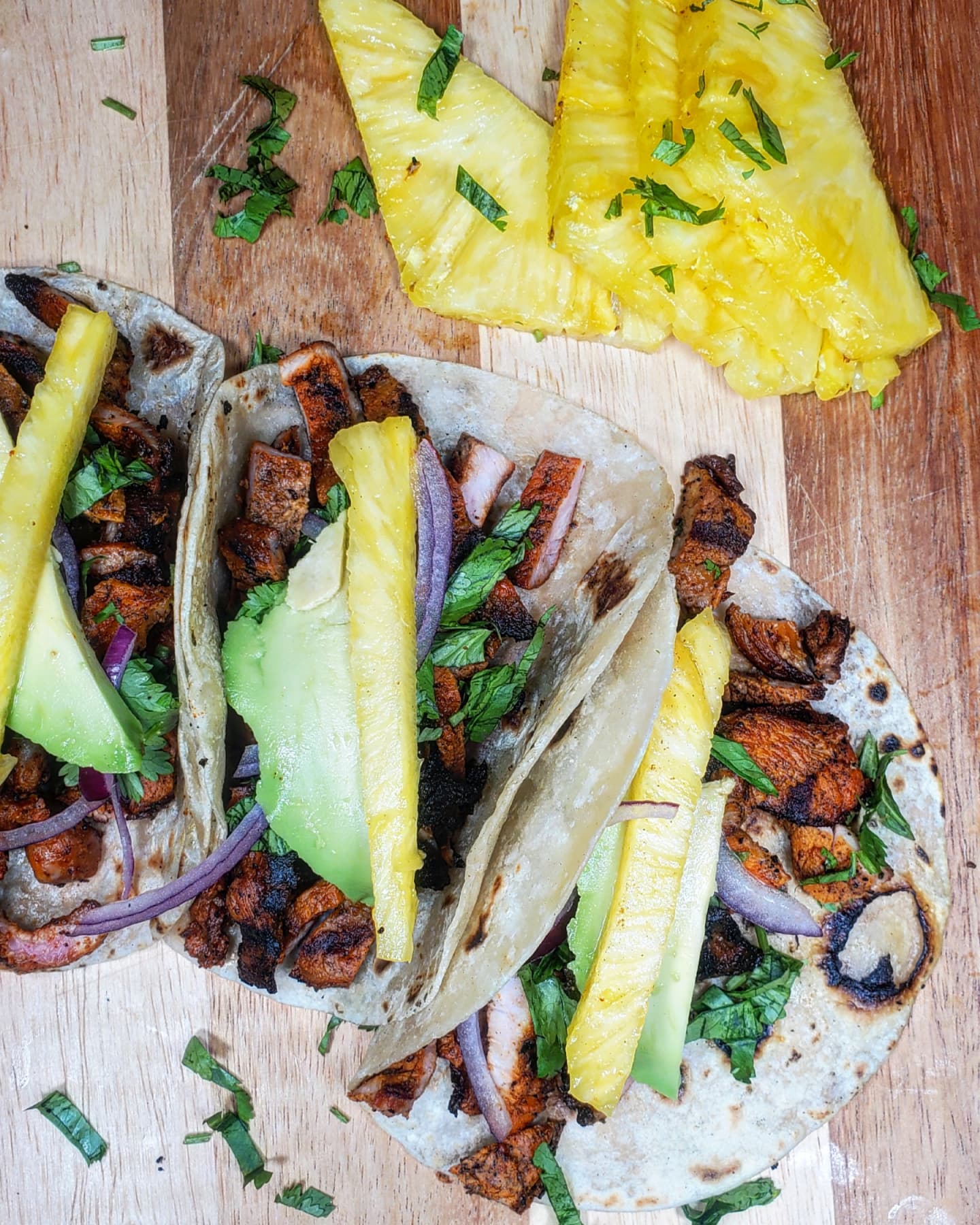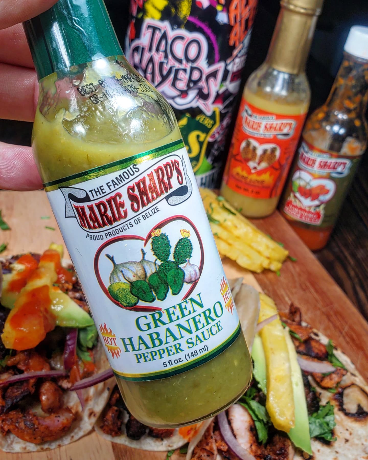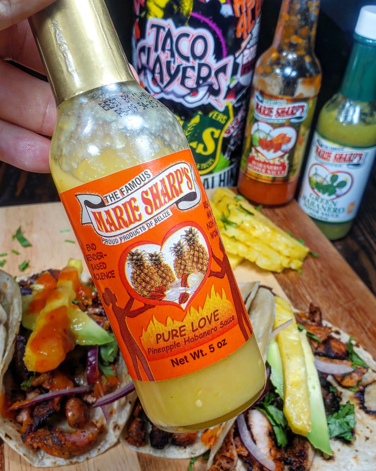 Once back home, I grilled up the adobada over the fire contained in my @charbroilgrills. After chopping up pineapple, cilantro and onion I loaded each taco up with COPIOUS AMOUNTS of @mariesharpsusa Hot sauces.