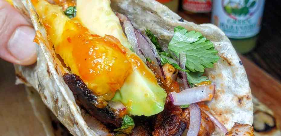 Once back home, I grilled up the adobada over the fire contained in my @charbroilgrills. After chopping up pineapple, cilantro and onion I loaded each taco up with COPIOUS AMOUNTS of @mariesharpsusa Hot sauces.