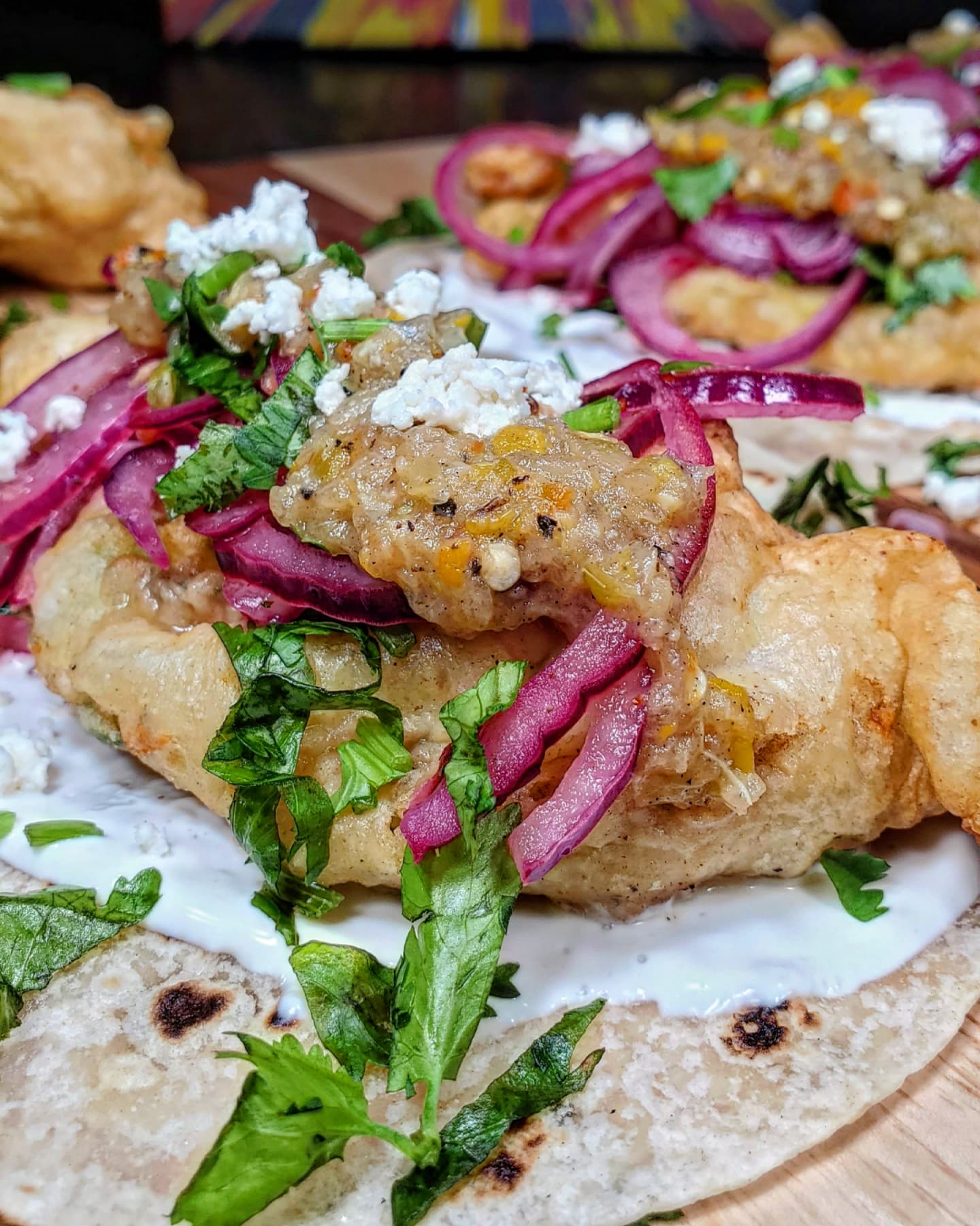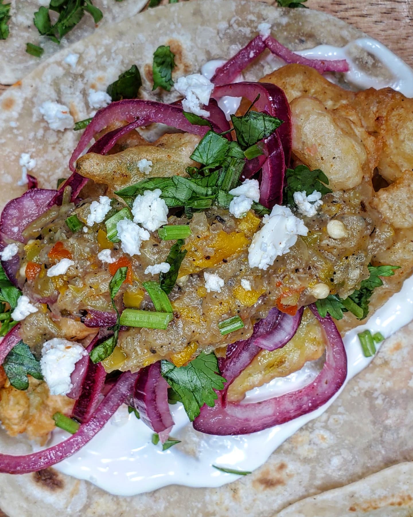 Finally I piled all my ingredients together on a toasted flour tortilla. First a layer of sour cream followed by the main attraction the fried squash blossom then cilantro, pickled red onions, the salsa and a little queso fresco.