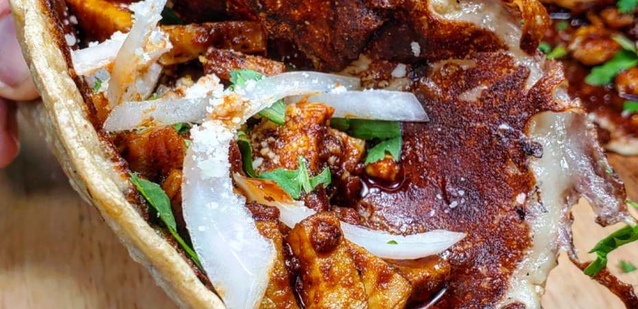 While the meat flavors mixed I heated up a couple corn tortillas with mozzarella melted and crusted to the surface. Once the meat was completed I covered the the tortilla with a few spoonfulls.