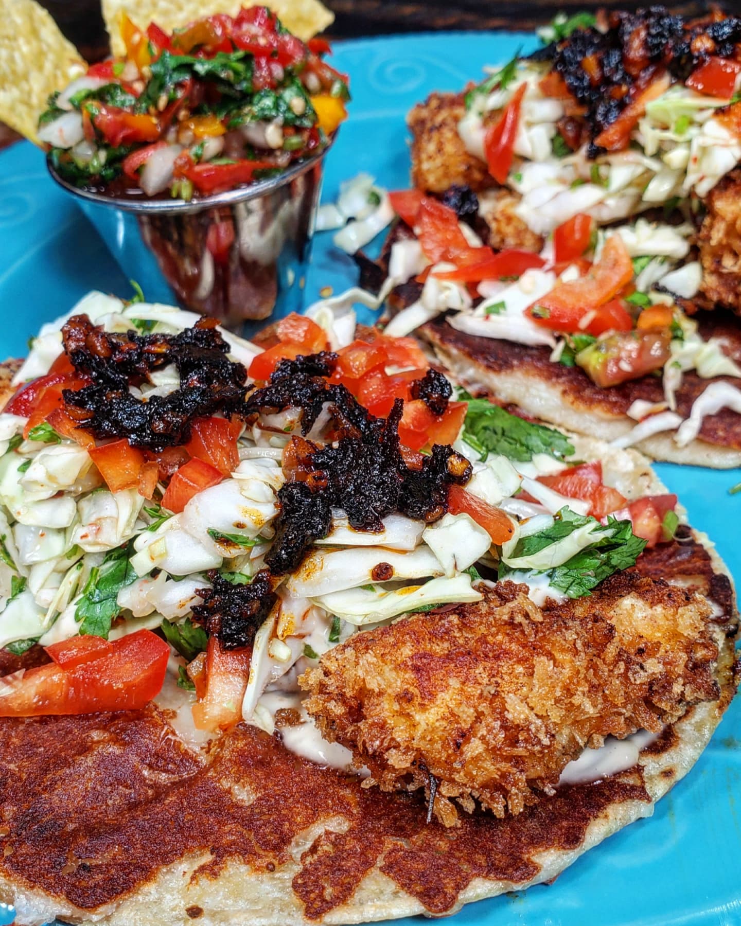 We built up the #mahimahi casket with a corn tortilla coated with crisp’d mozzarella cheese and a layer of tarter sauce. Over the fish we placed in a scoop of citus slaw(cilantro,cabbage, orange juice, lime juice, and red peppers) and a sprinkle of sliced red bell peppers (honestly the most important ingredient). Finally I drizzled on some homemade super hot Salsa Macha I made a few weeks back.