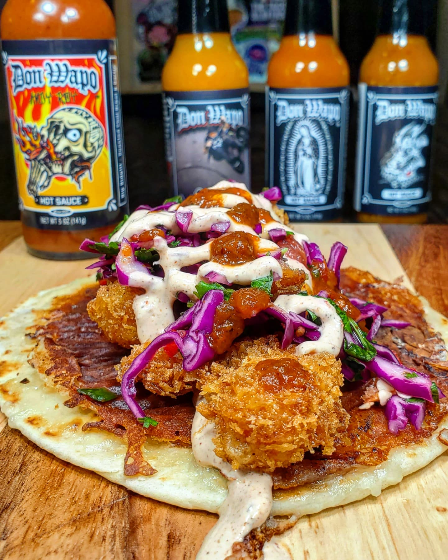 On a flour tortilla I melted and crisped up a little mozzarella cheese and layed down a layer of cream 😊 . Next I piled in a few shrimp and mounted the taco with a huge scoop of slaw. After another drizzle of chipotle cream i dropped in the Don Wapo RIP RIDE chile de arbol hot sauce all over the top.