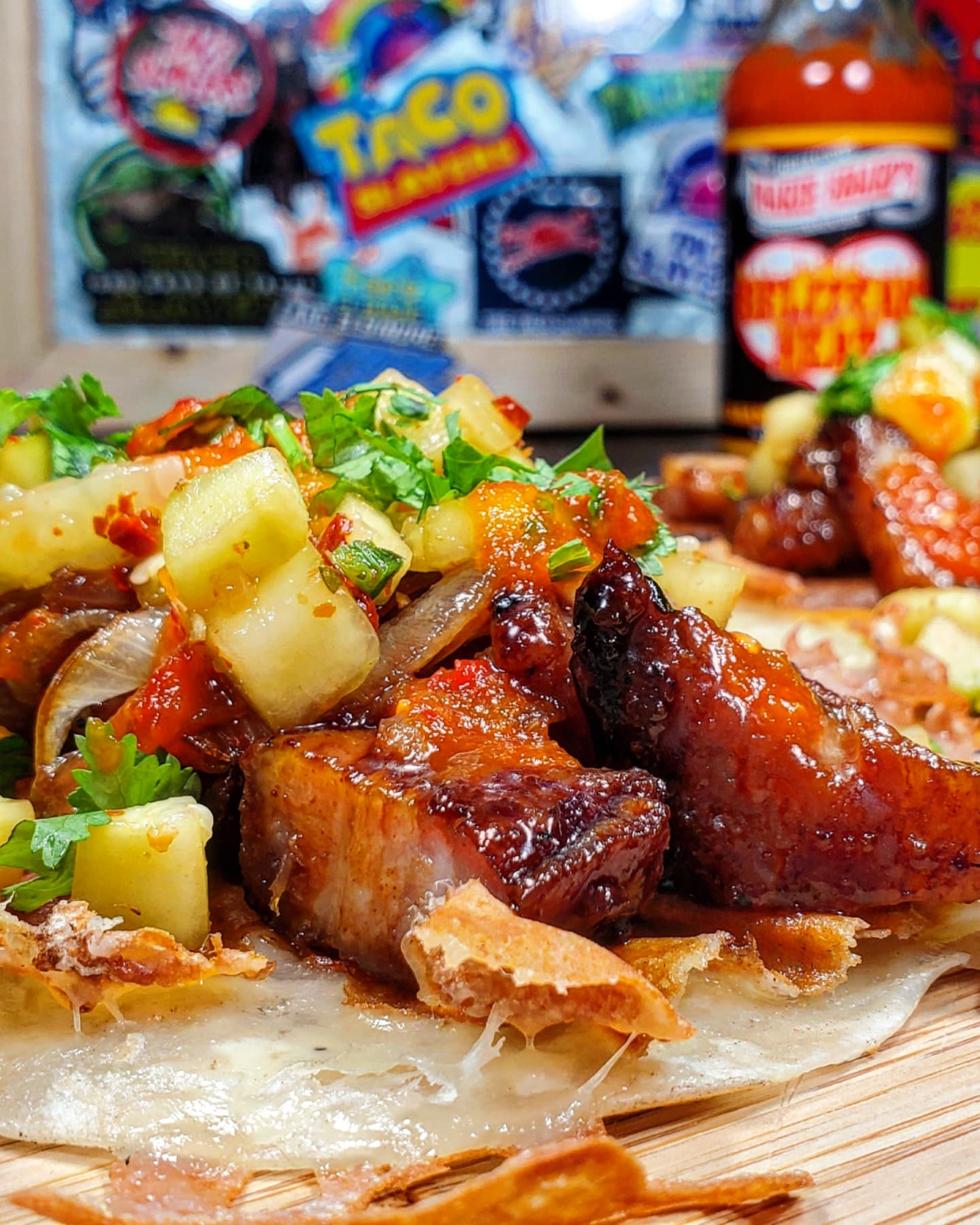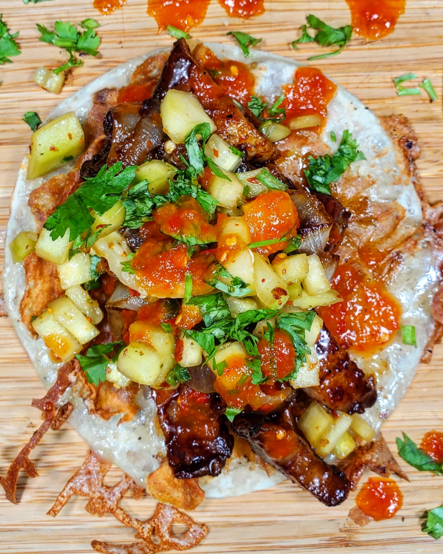 As my pork belly finished, I heated up some Sonora style flour tortillas and melted a little mozzarella cheese to its surface and piled the chopped pork belly in. I mounted this taco up with both the cucumber concoction and carmalized onions before a sprinkle of cilantro rained down followed by a major storm drizzle of @mariesharpsusa BELIZEAN HEAT.