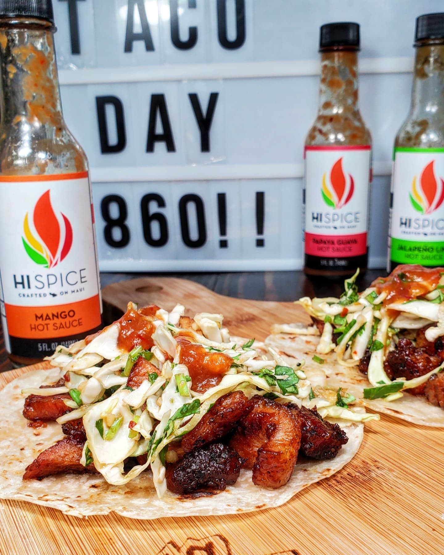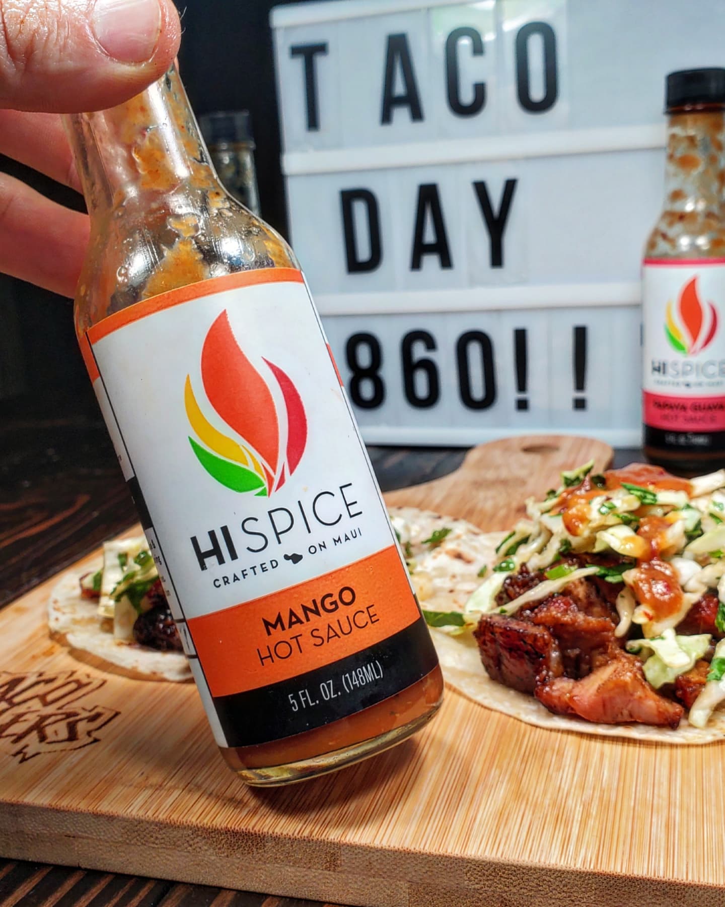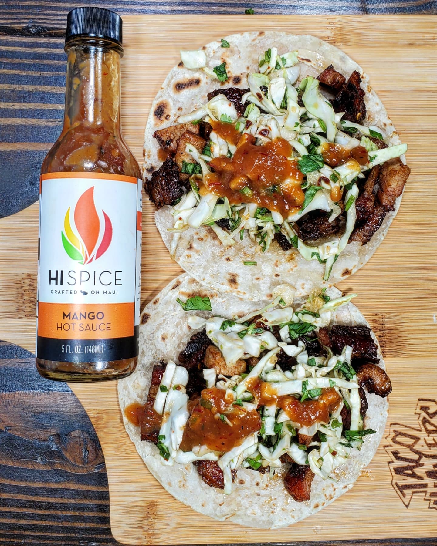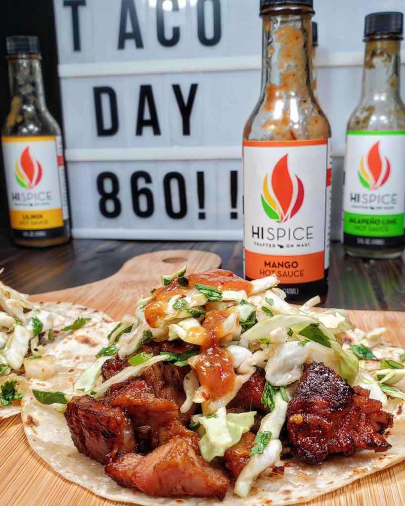 Next I chopped and dropped a mixture of the pork into a spicy sweet and sour sauce before it made its way into the flour tortillas with a pile of slaw over the top. I finished this taco off with several drizzles of @hi_spice Mango, the perfect hot sauce to increase the heat and sweetness of this taco entry.