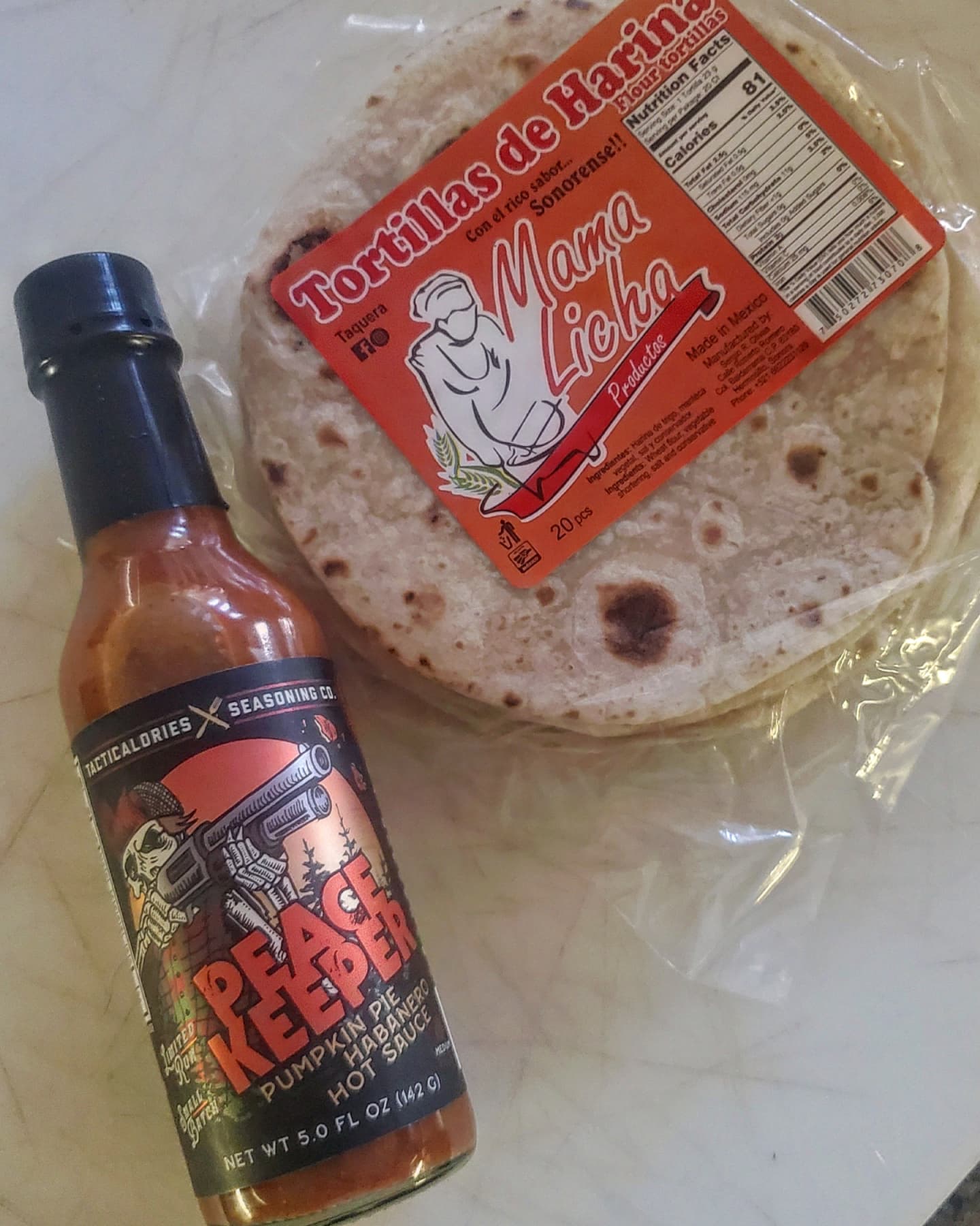 My mother-in-law cooked up a feast for us this holiday! With all the proper fixings and the Tacticalories Peace Keeper Pumpkin Pie Habanero hot sauce I was able to make the turkey taco work. I used some mama liche flour tortillas and scooped in the mashed potatoes, turkey, stuffing, green bean, and a large pouring amount of gravy….it had to be done. Gobble gobble!