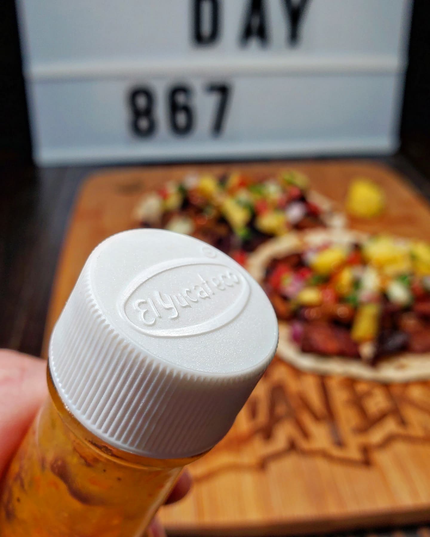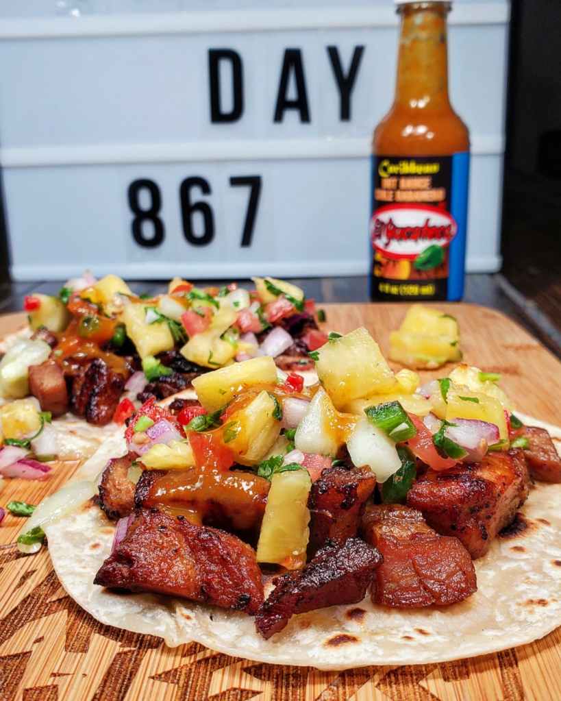Using some pre seasoned pork grilled up from @adaptablemeals I chopped up and piled inside a couple flour tortillas. Over the tacos I piled in mounds of a homemade cucumber, pineapple, and jalapeno salsa. Atop the salsa I laid in a few drizzles of Caribbean hot sauce from @elyucateco_hotsauce . So bomb!