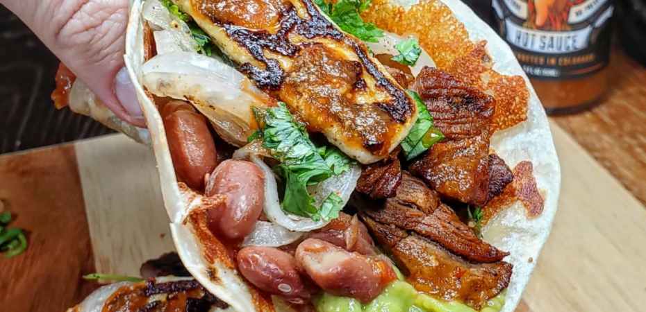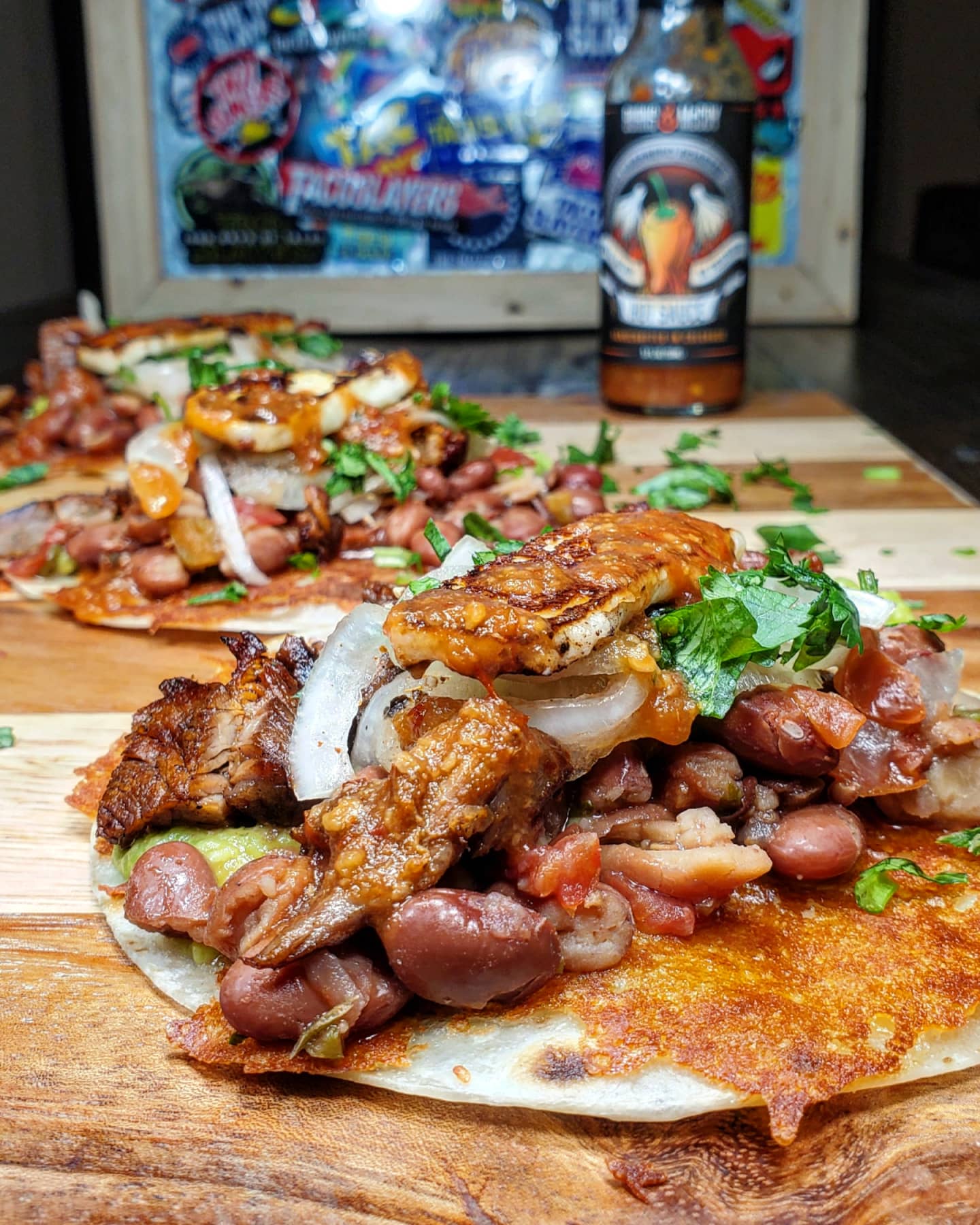 Next I warmed up a flour tortilla and coated it in mozzarella cheese and cooked up till the cheese was crispy. I piled in a few spoonfulls of @yucatanguac along with both the beef and beans. Over the top, I piled in cilantro, onions, and a crispy piece of queso fresco.