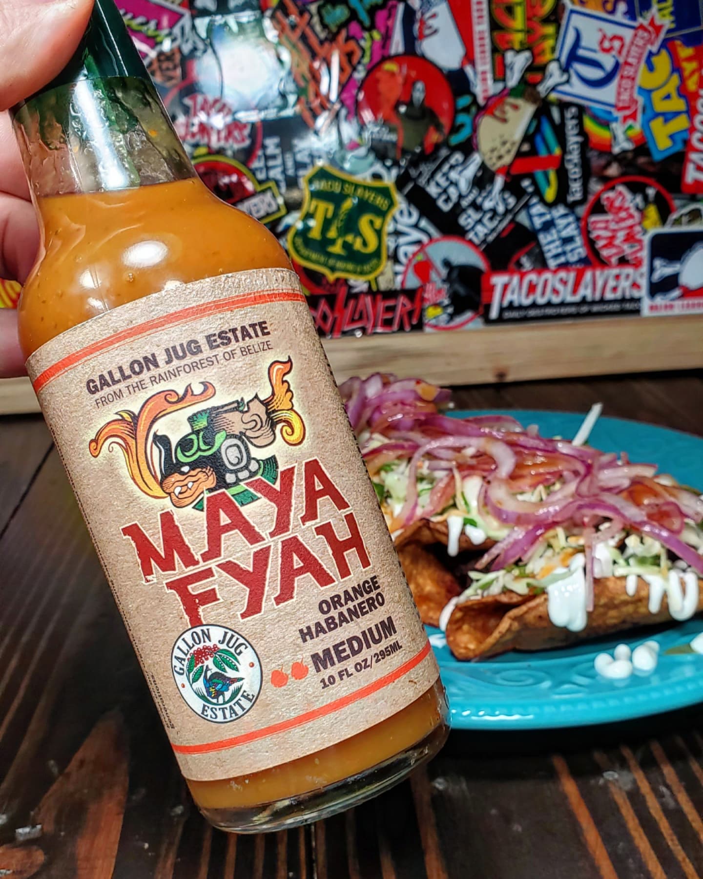 Last week I made 30+ ground beef dorados and the ones we didn’t eat we frozen to airfried up later. And once I heated these guys up I drizzled in sour cream, Vinegar tossed cilantro and cabbage, lime soaked mexican onion, along with a whole bunch of Maya Fyah! The sauce was not very hot but had such a solid flavor and it really complimented these tacos well.