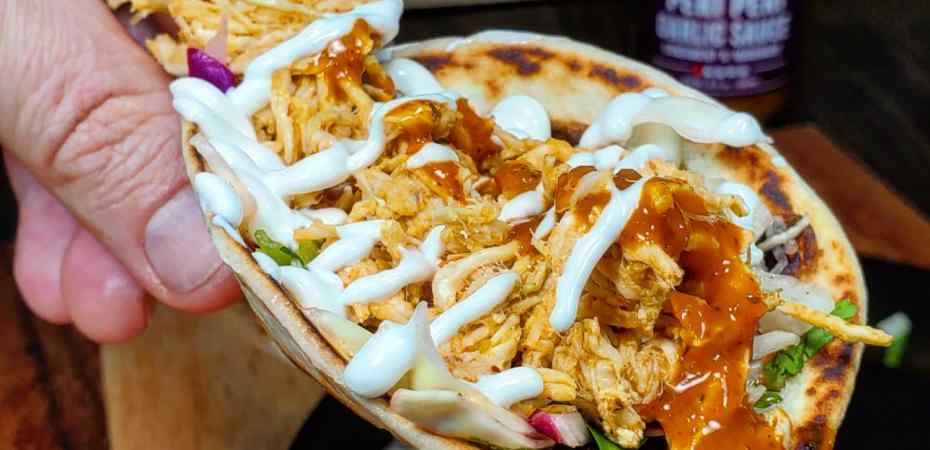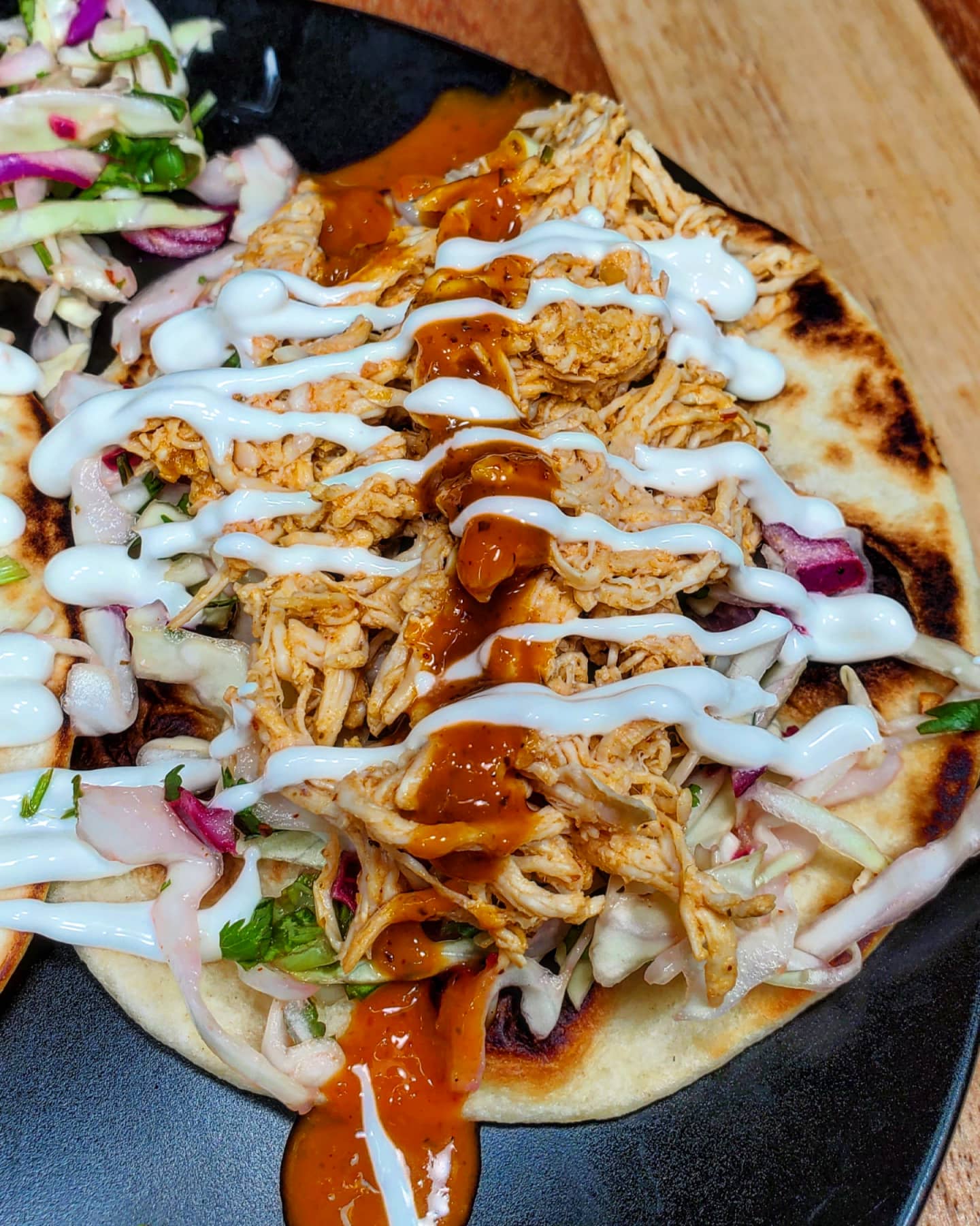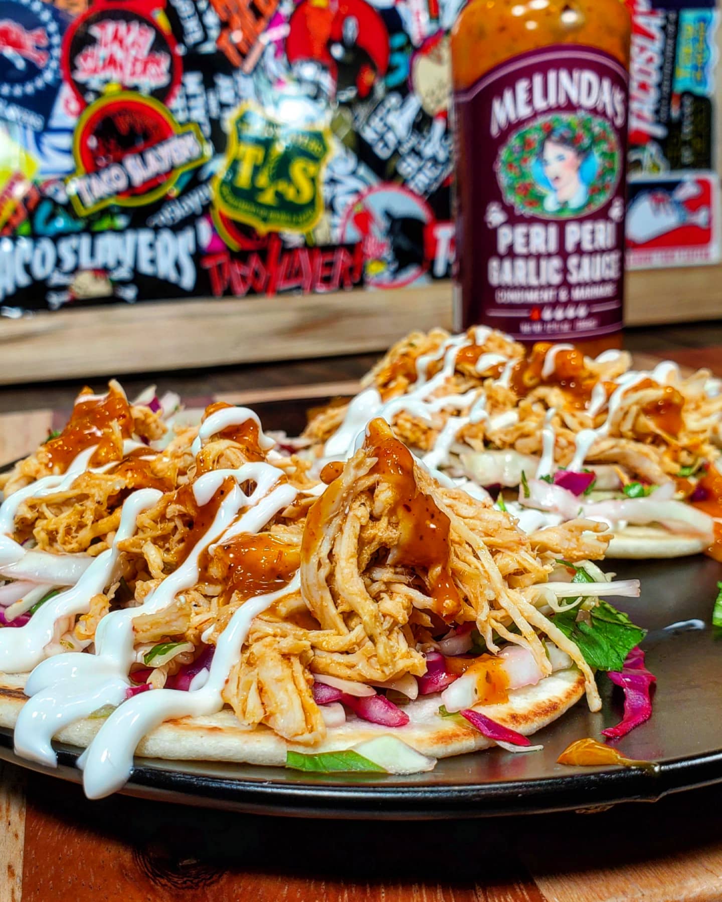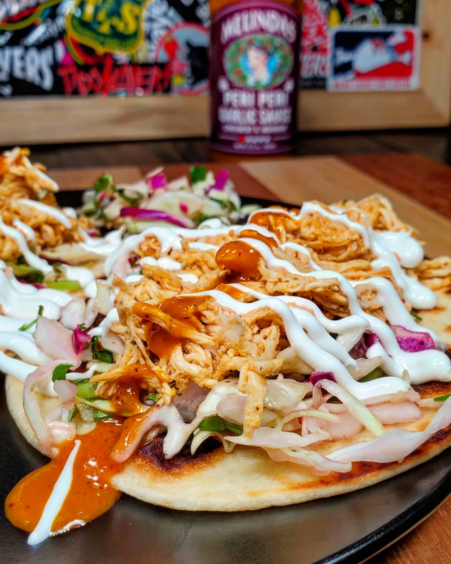 Yesterday we tried something a little different. After shredding up a few chicken breasts I seasoned them up with @melindasfoods Peri Peri Garlic Sauce and piled them into some flour tortillas with a delicious citrus cabbage slaw. Holy smokes was it delicious.