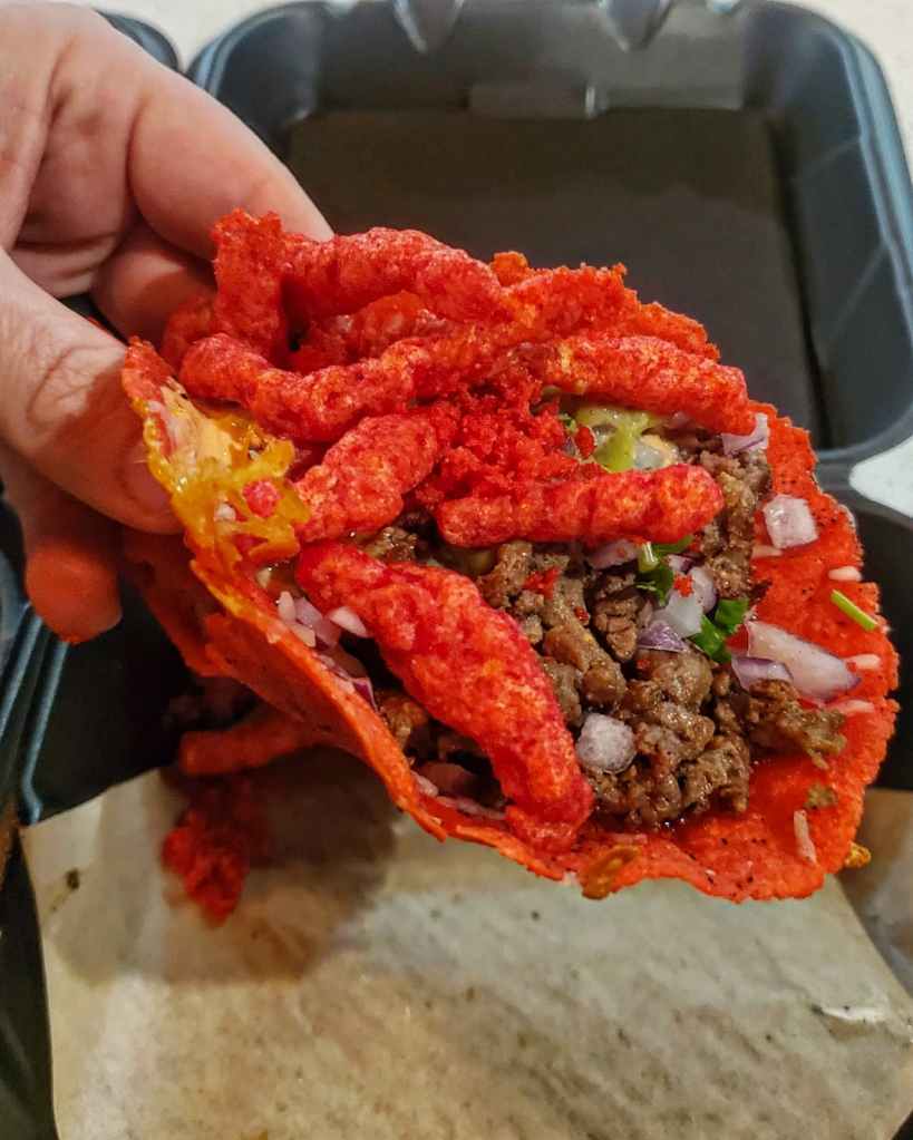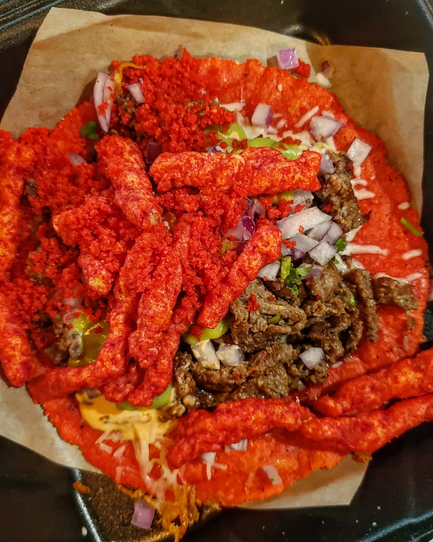 The building is littered with beautiful murals and art pieces with a spotless dining area. You can tell the staff takes pride in their store and that made me anxious for the tacos. I ordered up their Hot Cheeto Taco which came stuff to capacity on a large flaming hot red tortilla with a queso base, cilantro, onions, green sauce and topped in their namesake cheetos.