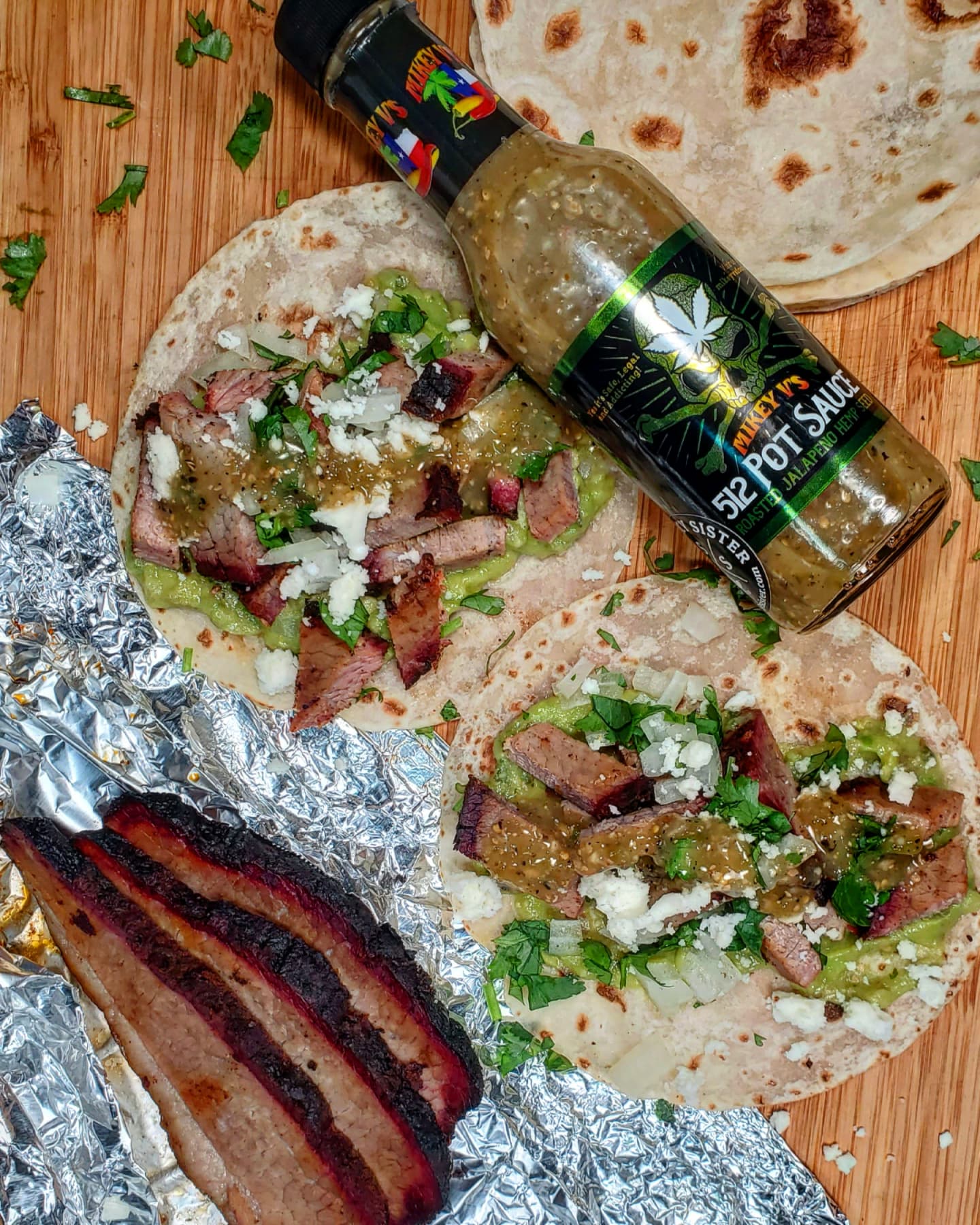 With a few toasted flour tortillas I scooped in some guacamole and piled in some chopped up brisket. Next, we added queso fresco, cilantro, and onions. Topping these tacos off was a huge drizzling @mikeyvshotsauce roasted Jalapeno & hemp seed 512 Pot Sauce that I picked up from my favorite local sauce shop @thespicysister.ca ..