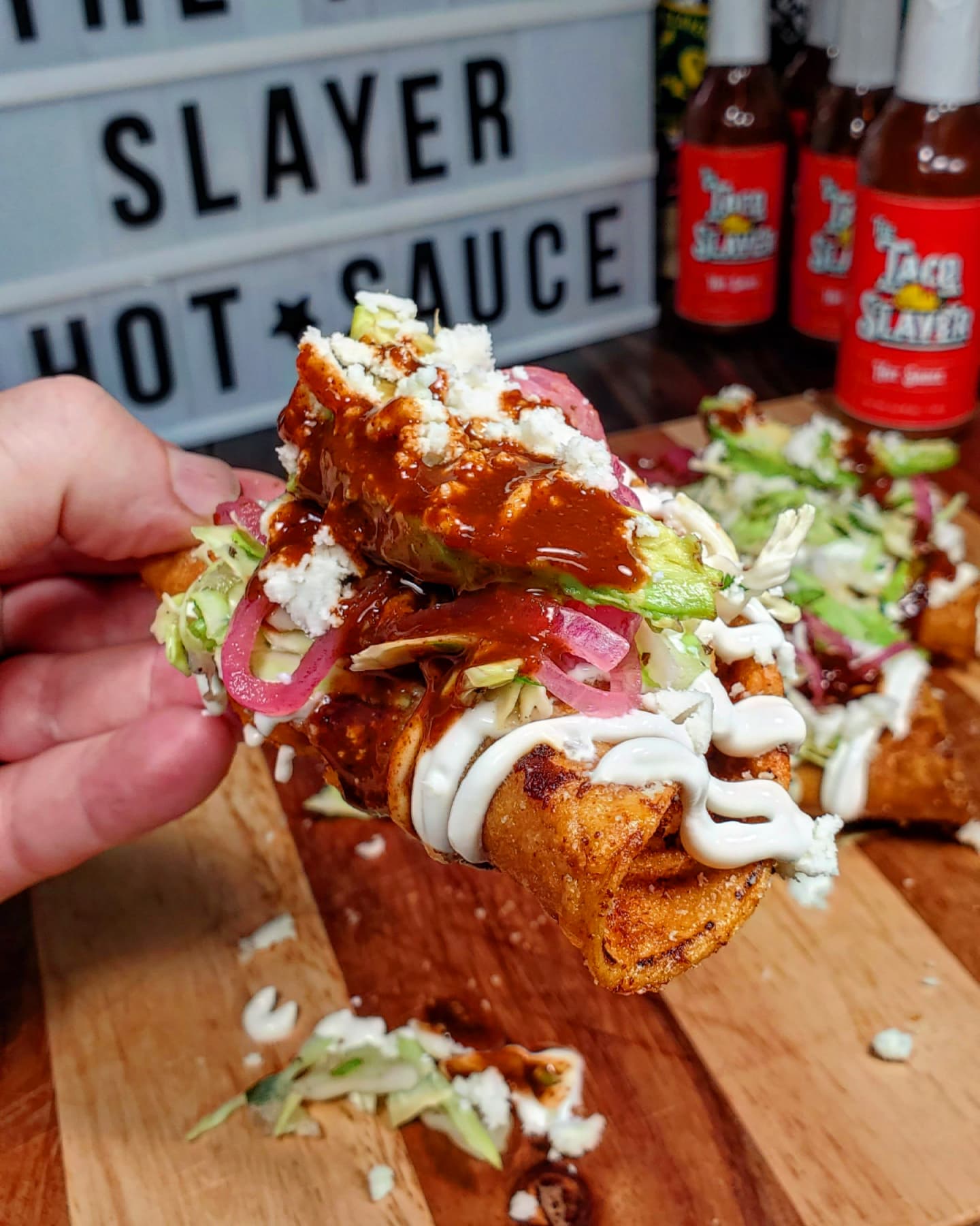 WAGYU TACO DORADOS WITH THE TACO SLAYER HOT SAUCE